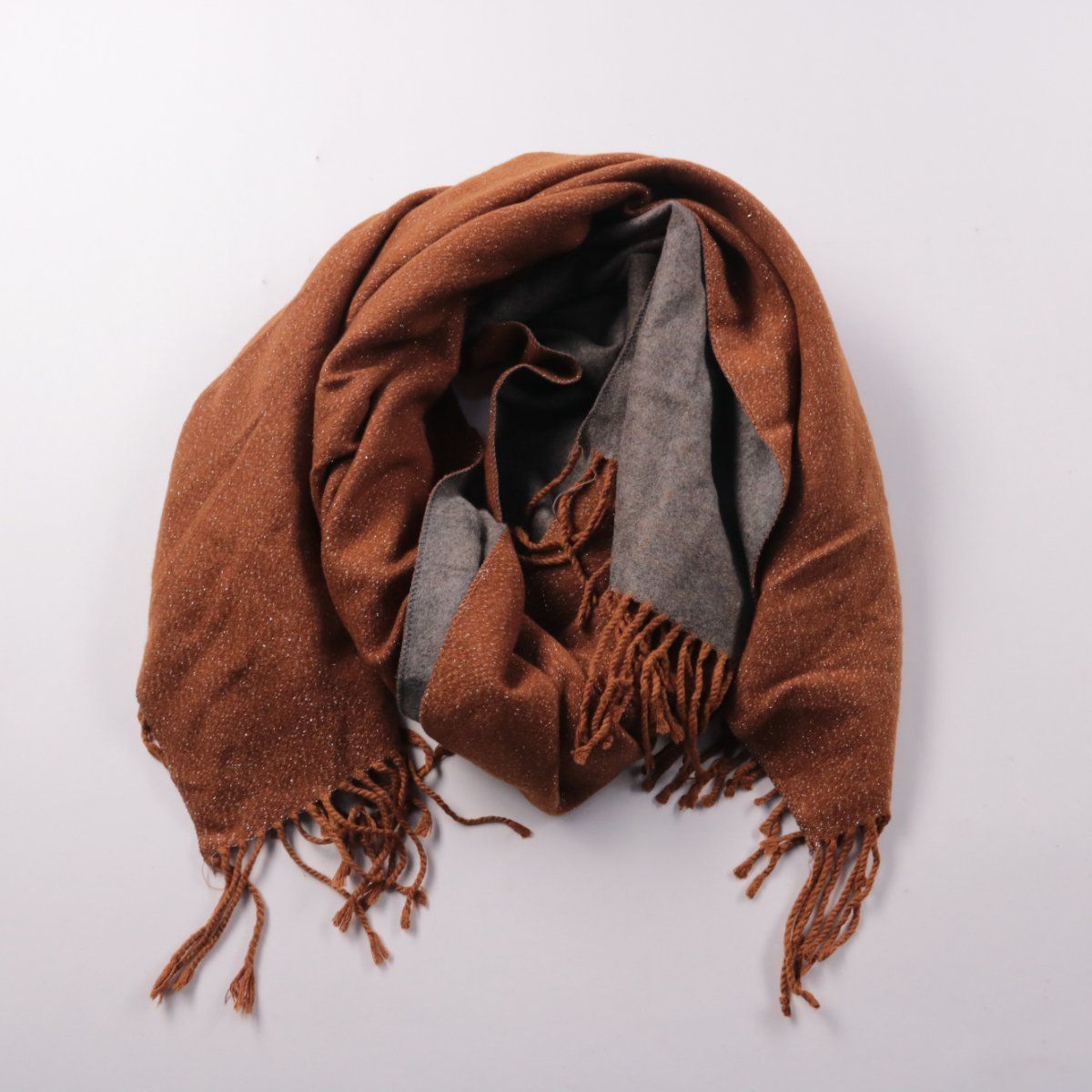 Шарф с бахромой в коричнево-серой гамме, подойдёт для повседневных образов и в офис. Оптимален на прохладную погоду весной и осенью, можно носить поверх пальто или куртки. Смесовая ткань (20% шерсть, 30% хлопок) приятна на ощупь и проще в уходе, чем 100% шерсть.
