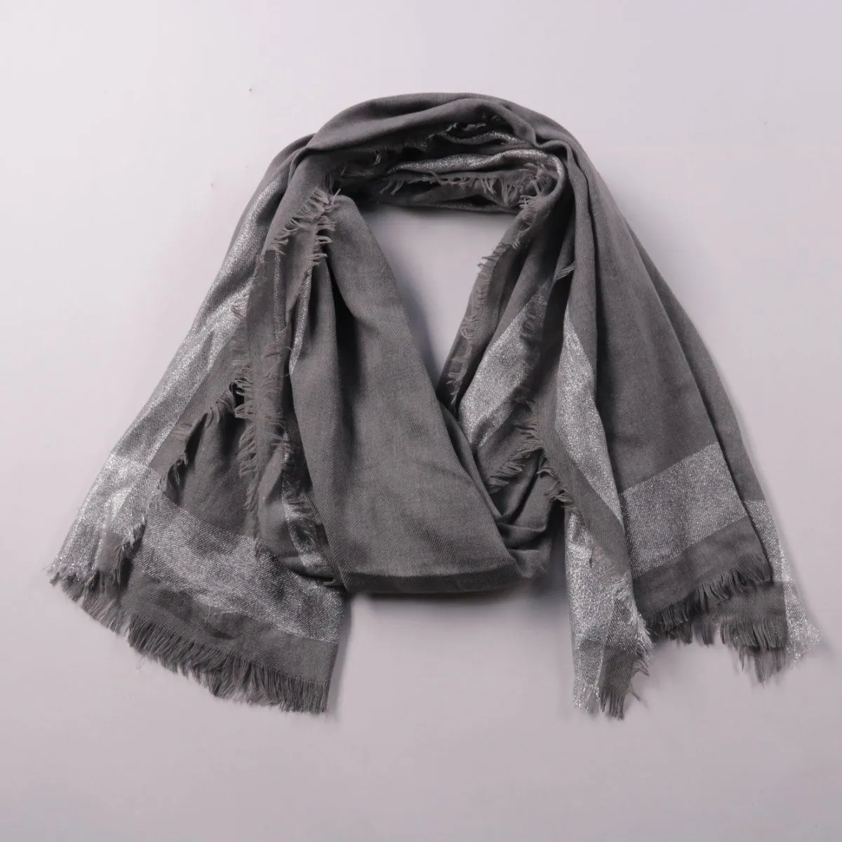 Шарф RSVP серого цвета с серебристым блеском и декоративными полосами, края с бахромой. Подойдёт для повседневных образов и как лёгкое утепление в прохладную погоду. Тонкий материал удобно драпируется и не занимает много места в сумке.