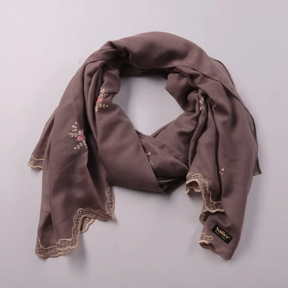 Платок Salire в приглушённом коричнево-сером оттенке с цветочной вышивкой и кружевной отделкой по краю. Подойдёт для повседневных образов и для более нарядных сочетаний. Лёгкий материал удобно складывается и не занимает много места в сумке.
