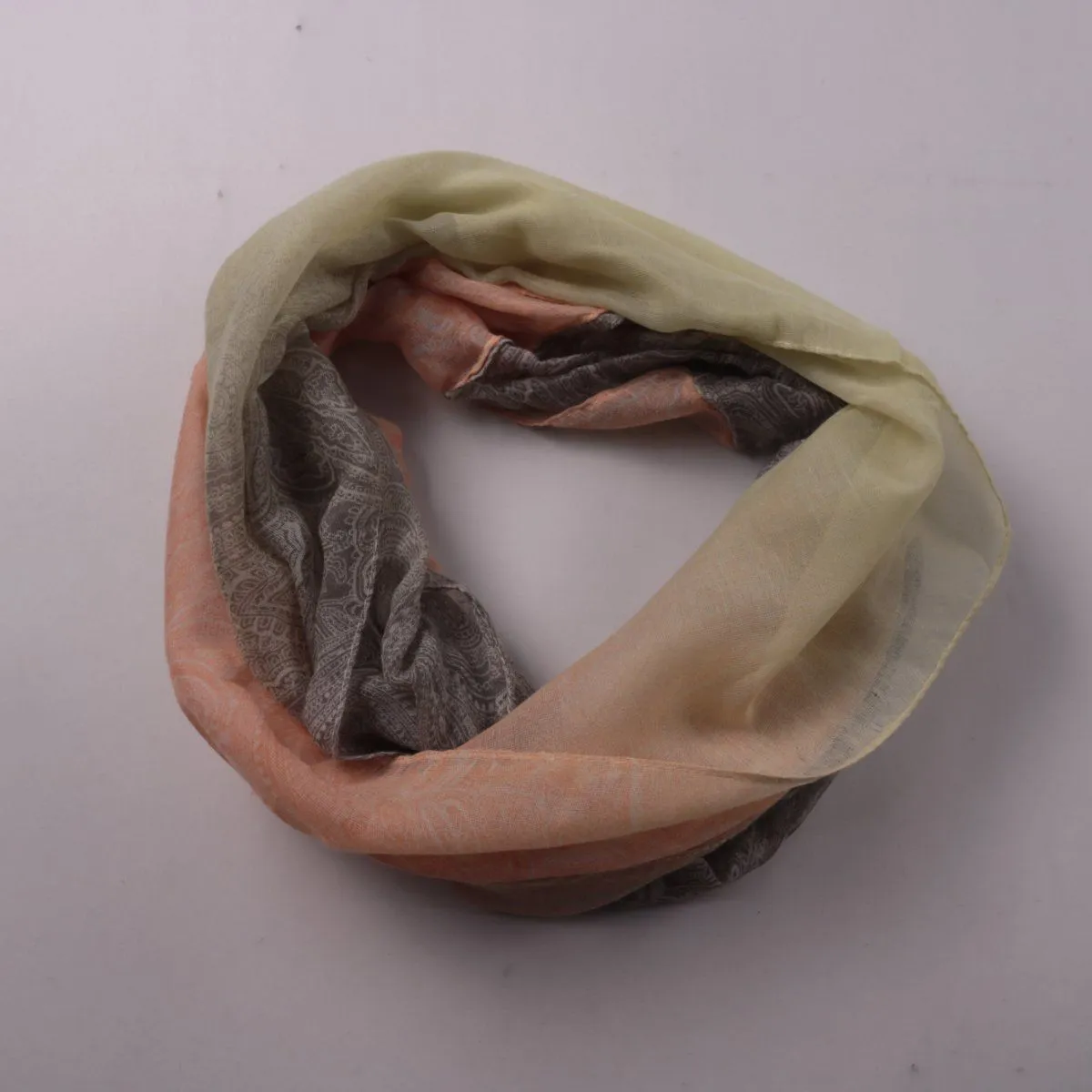 Лёгкий платок с узором пейсли в серо-бежево-персиковых тонах, бренд не указан. Подойдёт для повседневных образов: можно носить на шее, на голове или привязать к сумке — занимает мало места и быстро освежает образ.
