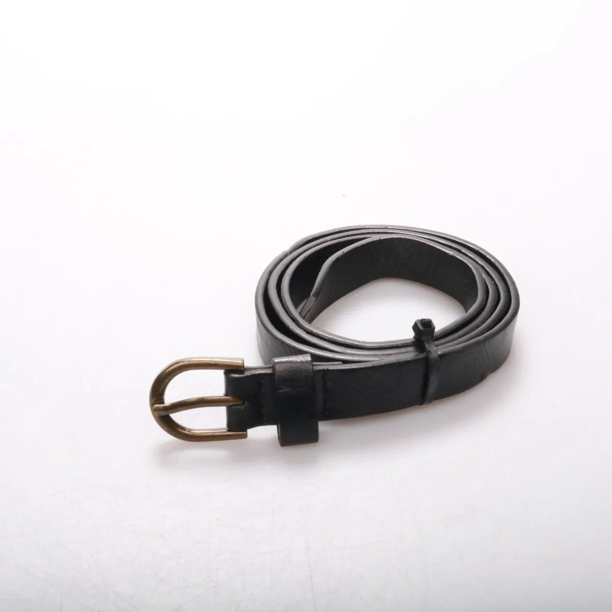 Унисекс ремень из чёрной кожи (или кожзама) с металлической пряжкой под латунь. Подойдёт для джинсов и брюк в повседневных образах, а также для кэжуал-офиса. Практичный плюс — классический цвет и простая пряжка легко сочетаются с разной обувью и сумками.