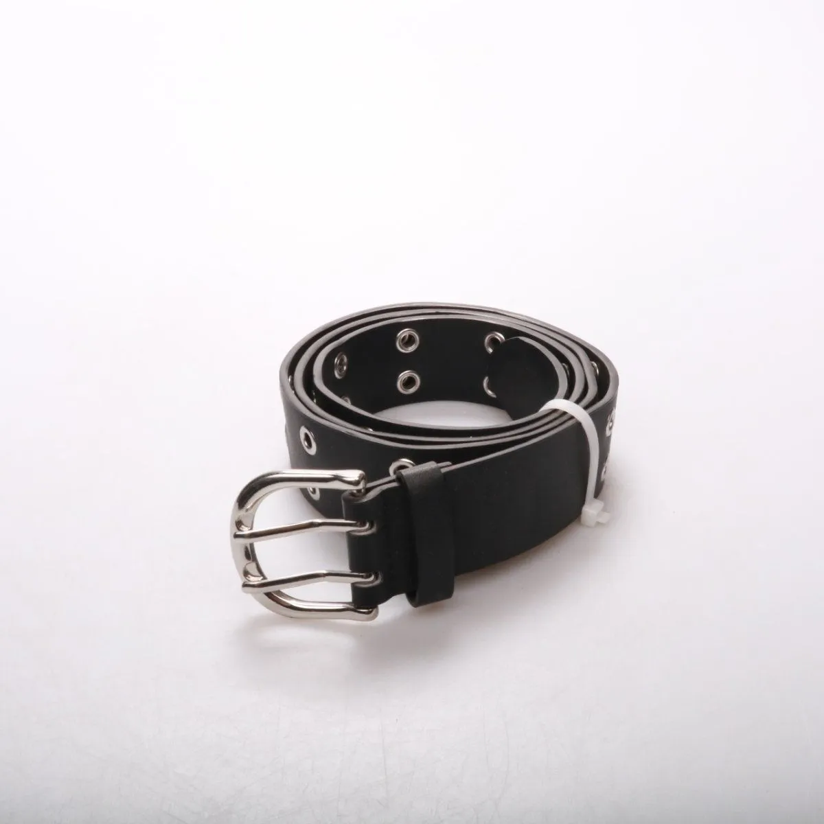 Чёрный ремень с люверсами и металлической пряжкой, подойдёт к джинсам, брюкам или юбке в повседневных образах. Благодаря множеству отверстий легко подгоняется по талии и удобно фиксируется.