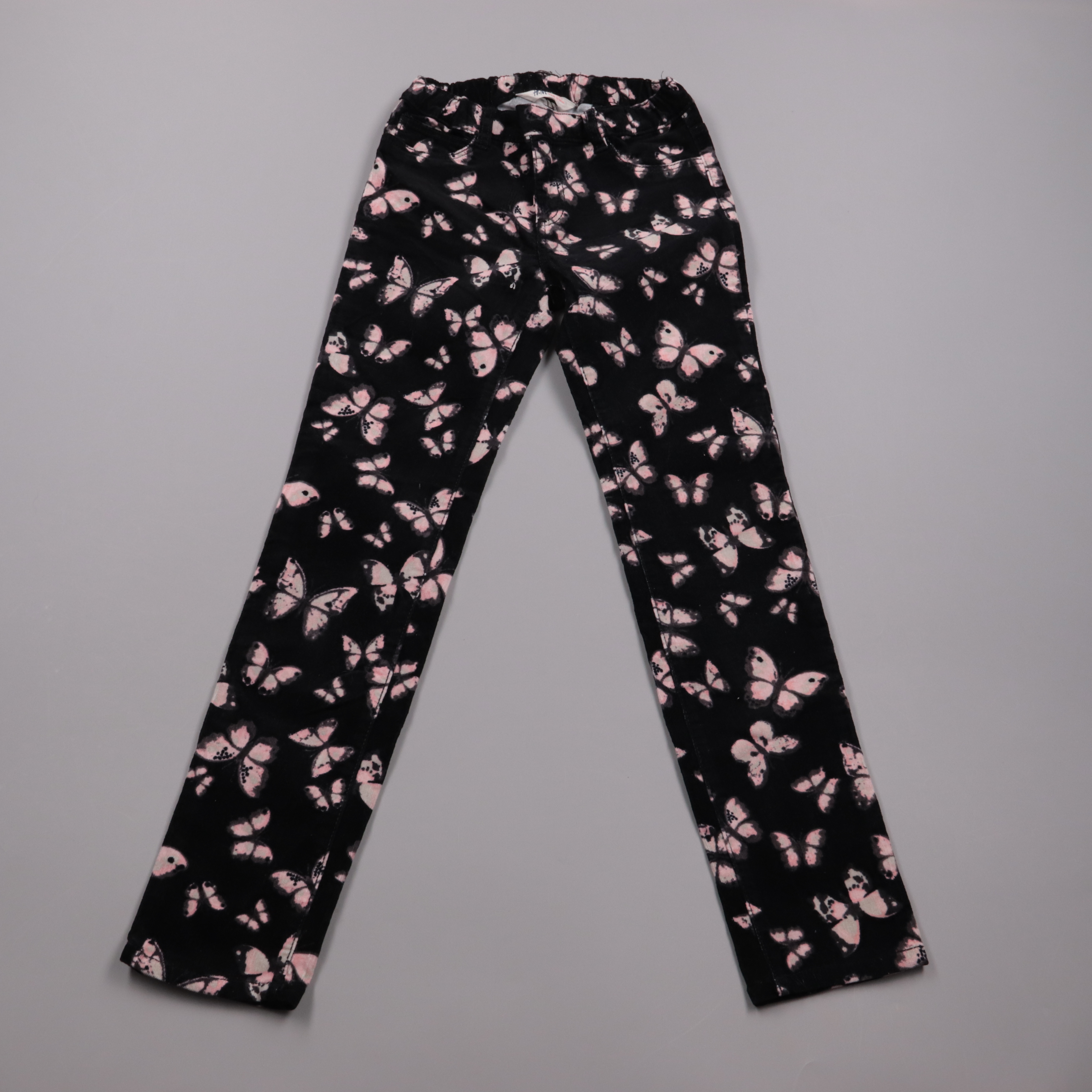 Легинсы H&M чёрного цвета с принтом розовых бабочек и эластичным поясом. Подойдут для повседневной носки в школу или на прогулки, легко сочетаются с футболками и худи. Тянущийся материал не сковывает движения и удобен в уходе.