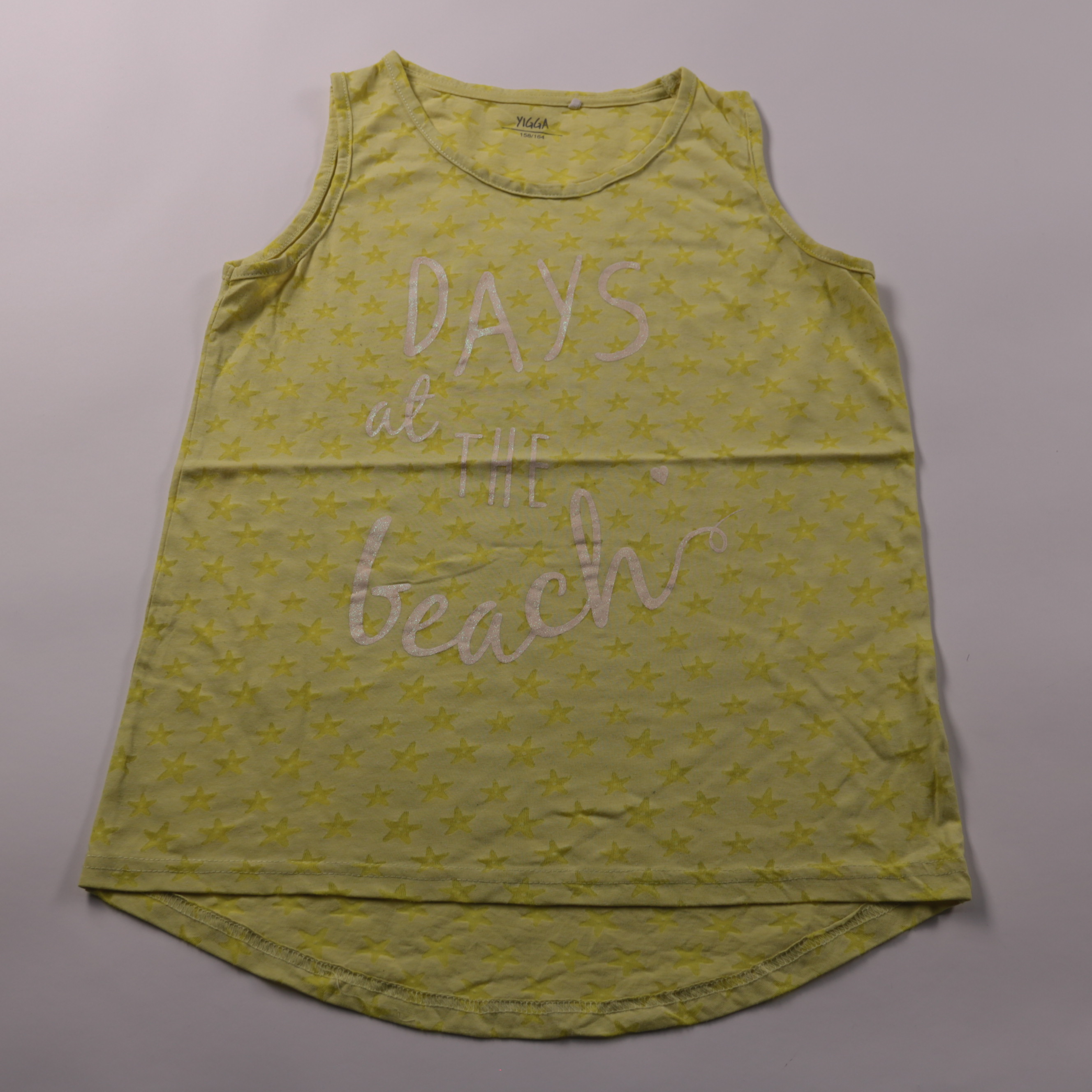 Топ Yigga жёлтого цвета со звёздным принтом и надписью «Days at the beach». Подойдёт для лета и отдыха, можно носить в школу или на прогулки. Лёгкий материал быстро сохнет после стирки.