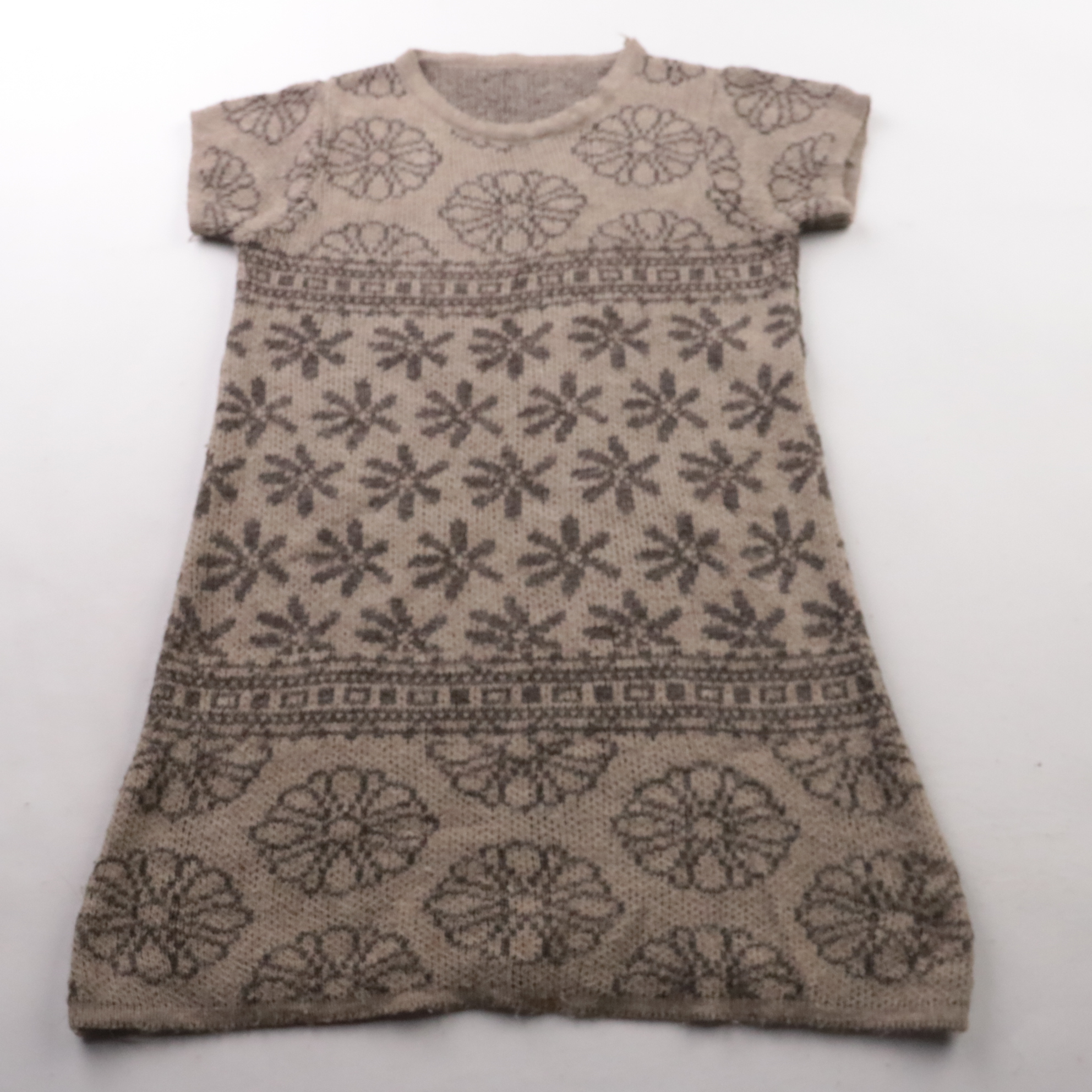 Вязаное платье для девочки с коротким рукавом и узором в серо-бежевых тонах, бренд на бирке не указан. Подойдёт для детского сада, прогулок и дома в прохладную погоду. Практично тем, что мягкое и тёплое и легко сочетается с водолазкой или лонгсливом.