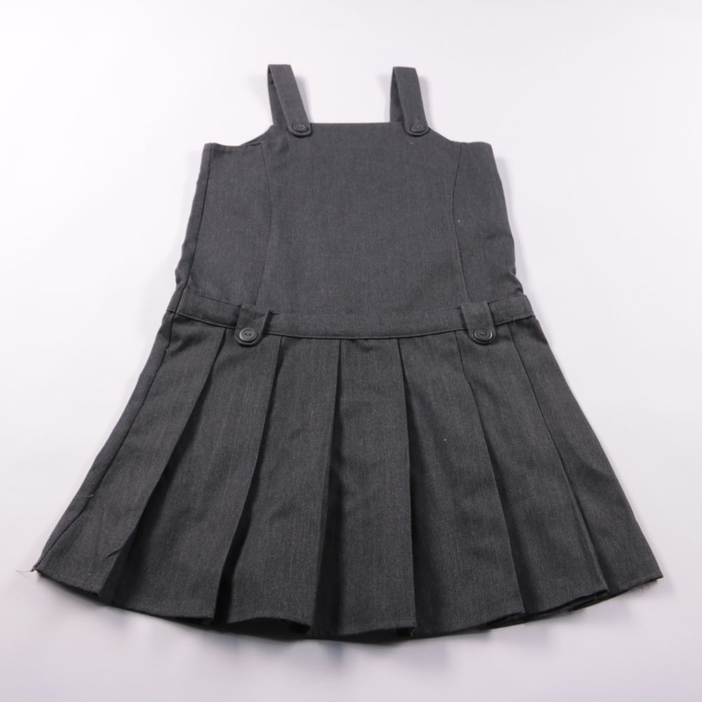 Школьное платье-сарафан Schoolwear тёмно-серого цвета с плиссированной юбкой и бретелями на пуговицах. Подойдёт для школы и повседневной носки в прохладное время с водолазкой или блузкой. Практичный материал легко стирается и держит форму.