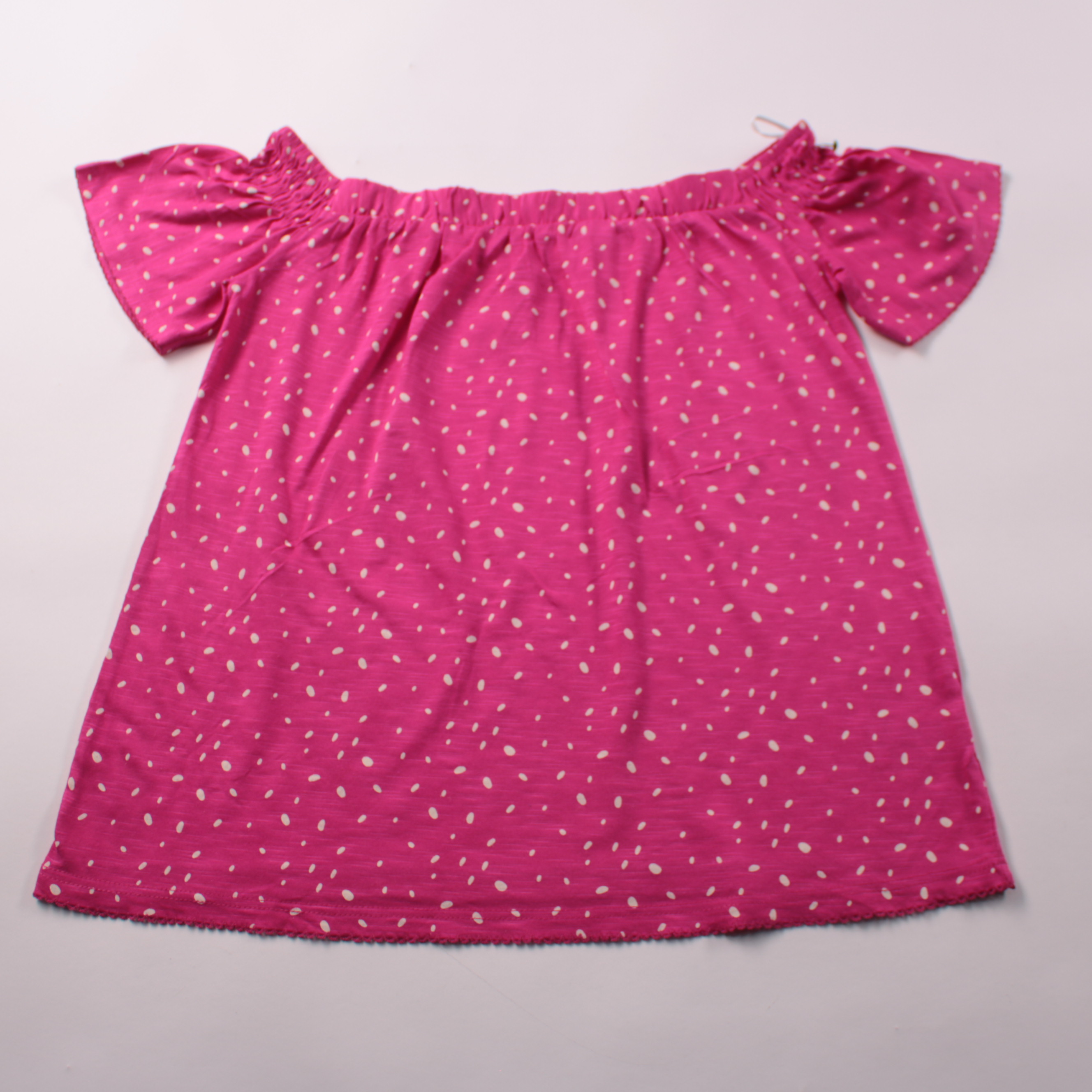 Летнее платье Next ярко-розового цвета с белым принтом и открытыми плечами. Подойдёт для прогулок и отдыха в тёплую погоду благодаря свободному крою и лёгкой ткани. Хорошо сидит и не стесняет движений за счёт эластичной горловины.