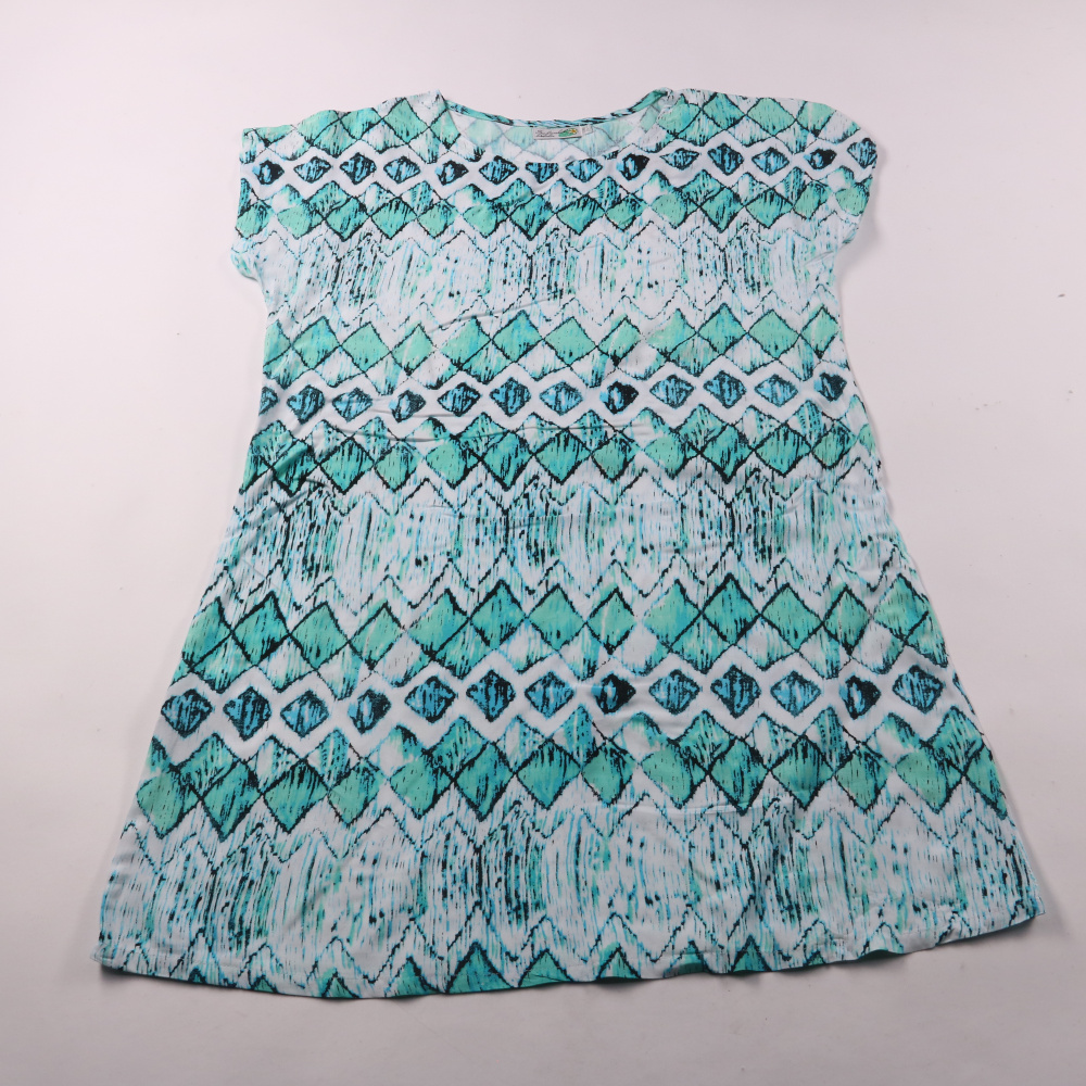 Платье Sundrenched для девочки с коротким рукавом и бирюзово-белым геометрическим принтом. Подойдёт для лета, отдыха и повседневных прогулок. Лёгкая ткань из 100% вискозы хорошо дышит и быстро сохнет после стирки.