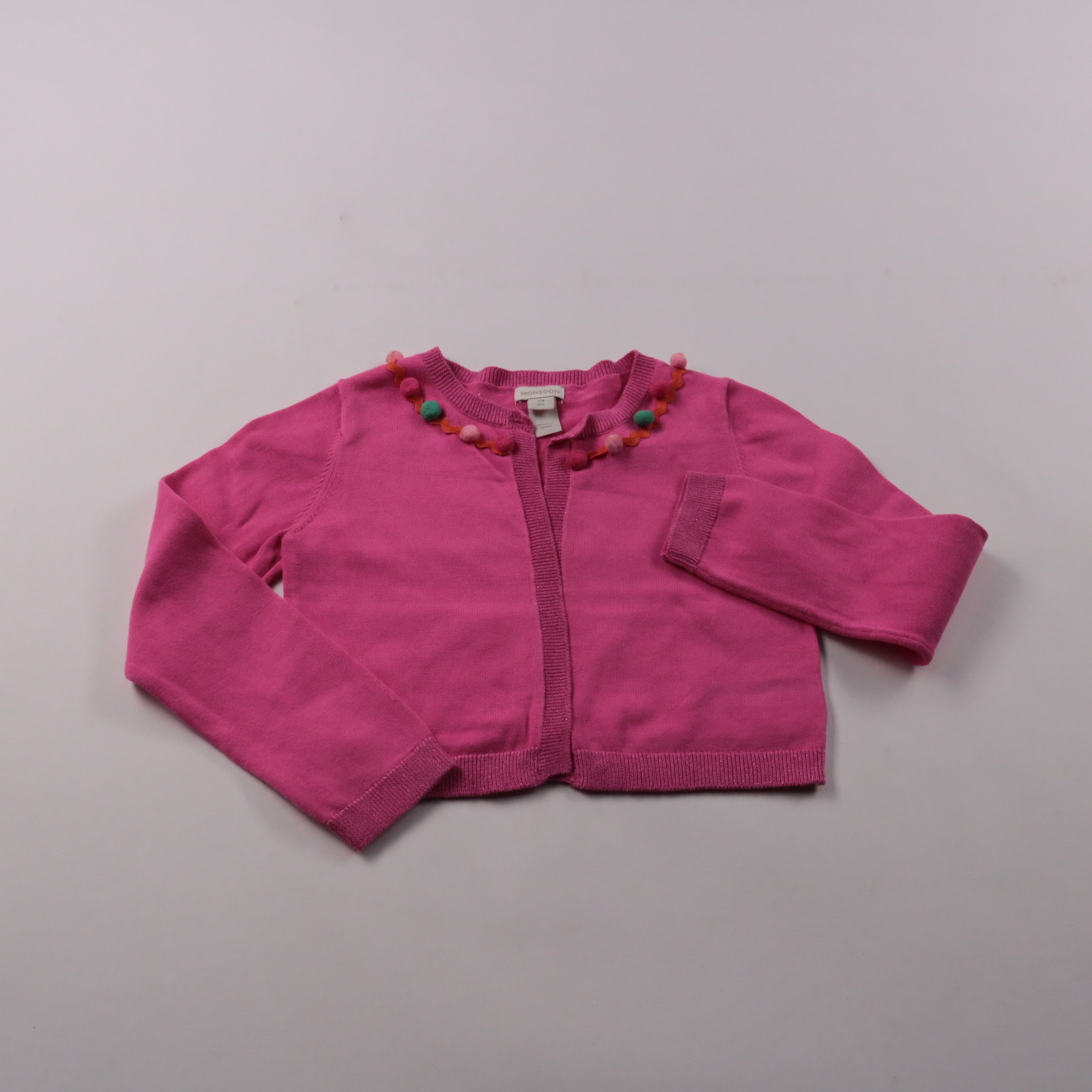 Кофта Monsoon ярко‑розового цвета, с декоративными помпонами по горловине. Подойдёт для школы и прогулок в прохладную погоду, удобно носить поверх футболки или платья. Мягкий трикотаж приятен к телу и легко стирается.
