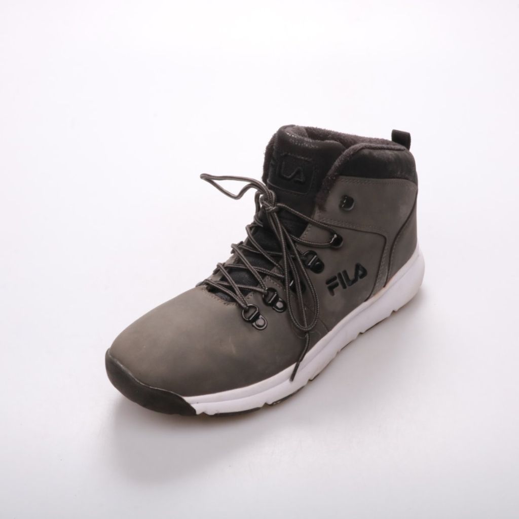 Мужские ботинки FILA в сером цвете с высокой посадкой и шнуровкой. Подойдут для повседневной носки в прохладную погоду и прогулок по городу. Рельефная подошва даёт более уверенное сцепление на мокром асфальте.