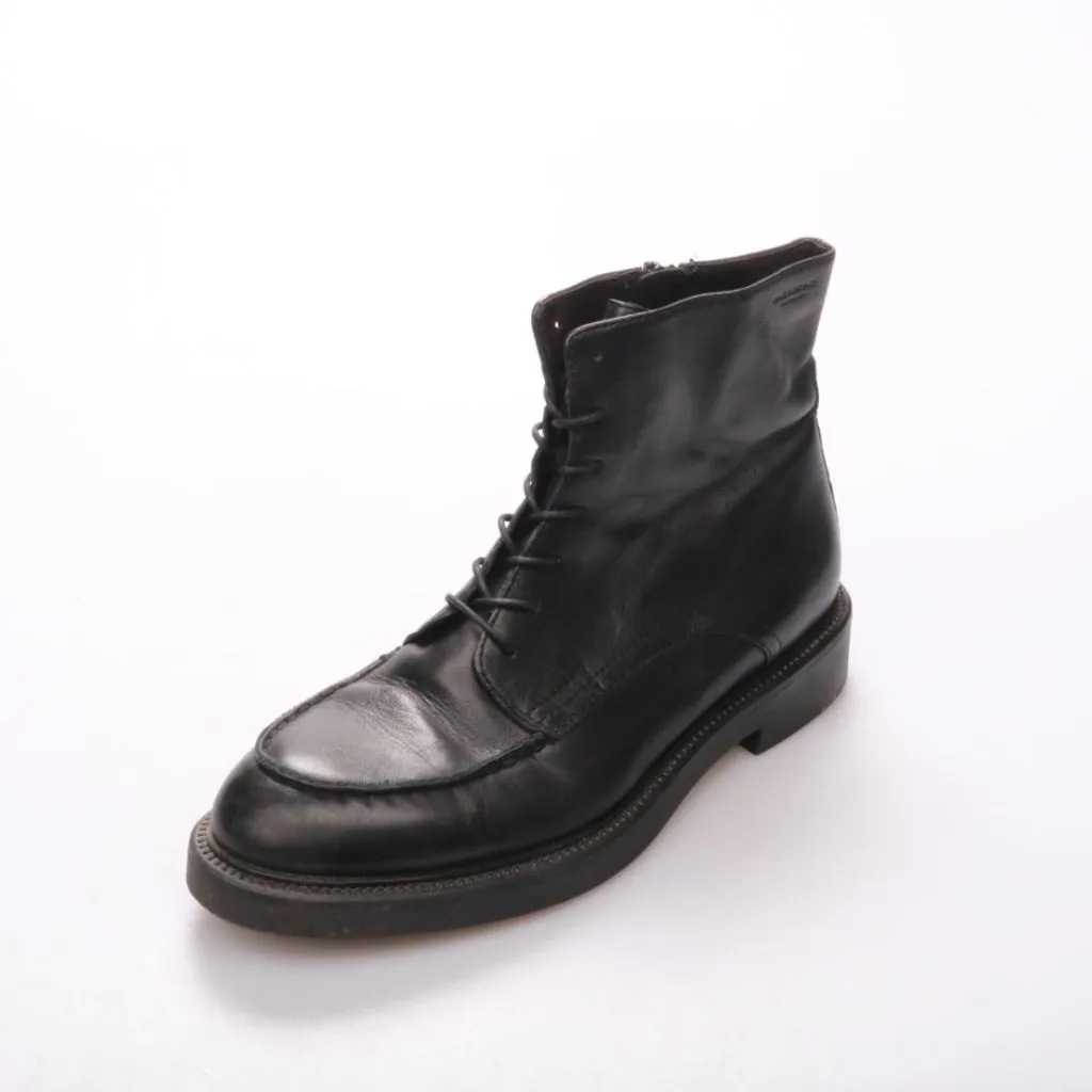 Ботинки Vagabond из чёрной кожи, укороченная модель со шнуровкой и боковой молнией. Подойдут для повседневной носки в городе в межсезонье и легко сочетаются с джинсами или чиносами. Практичная плотная подошва устойчивее на мокром асфальте.