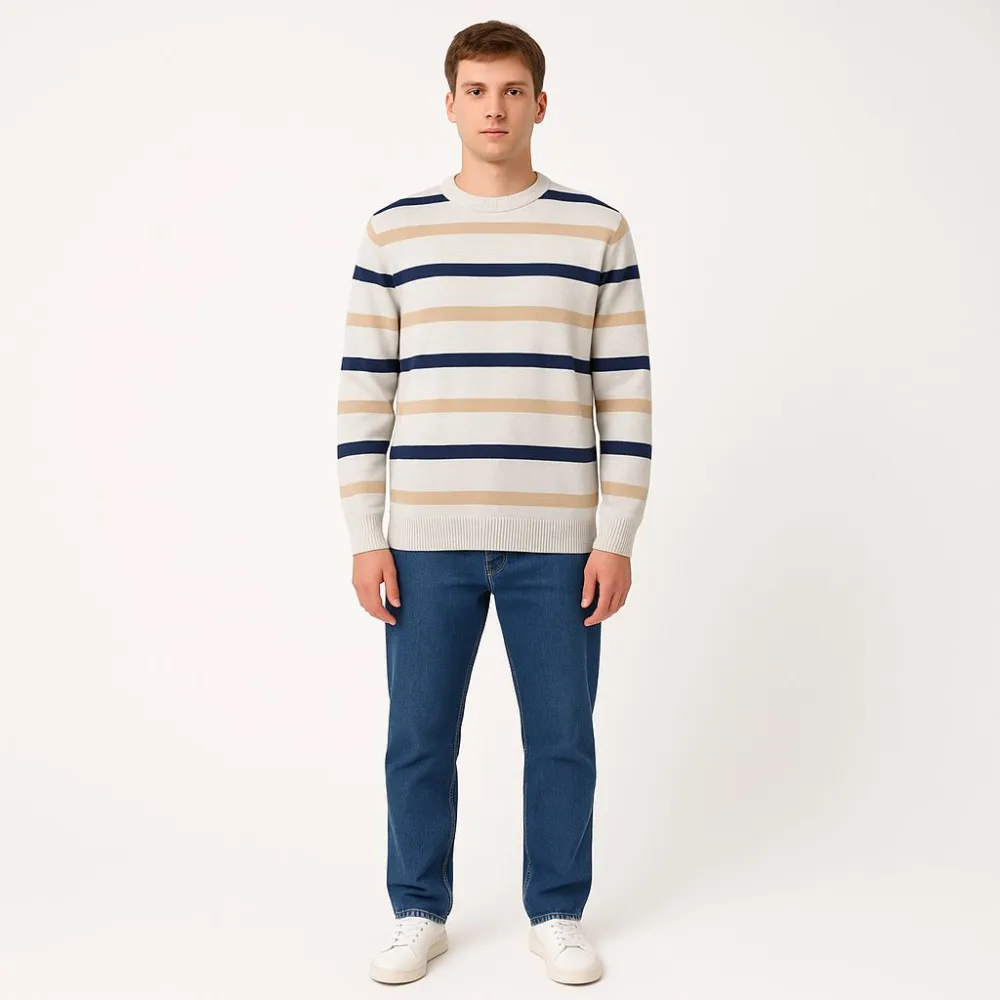 Мужской джемпер Canada в полоску (бежевый/синий/белый) с круглым вырезом и манжетами. Подойдёт для повседневной носки и офисного casual, легко сочетается с джинсами и брюками. Практичный вариант: мягкий трикотаж и базовый рисунок, который не выходит из...