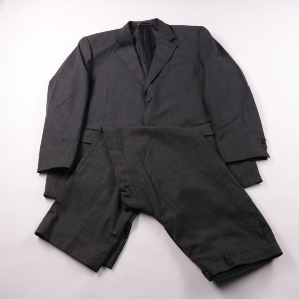 Мужской классический костюм Werther International тёмно-серого цвета в тонкую полоску: пиджак и брюки. Подойдёт для офиса, деловых встреч и торжественных мероприятий. Практичная ткань из 100% шерсти хорошо держит форму и выглядит аккуратно в течение дня.