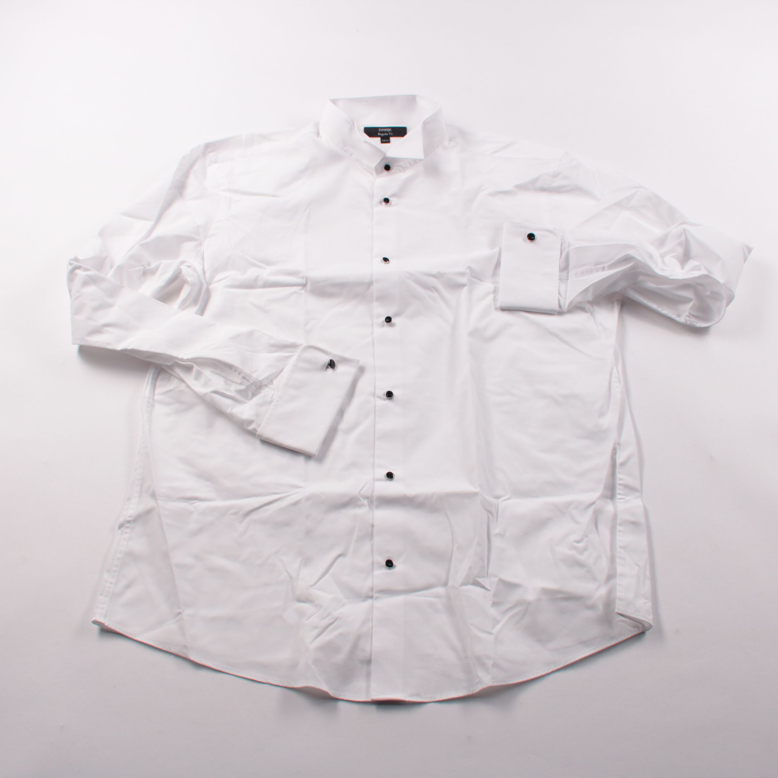 Мужская рубашка George Regular Fit белого цвета с длинным рукавом и контрастными тёмными пуговицами. Подойдёт для офиса, торжественных мероприятий и под пиджак. Практична в уходе и легко комбинируется с брюками и джинсами.