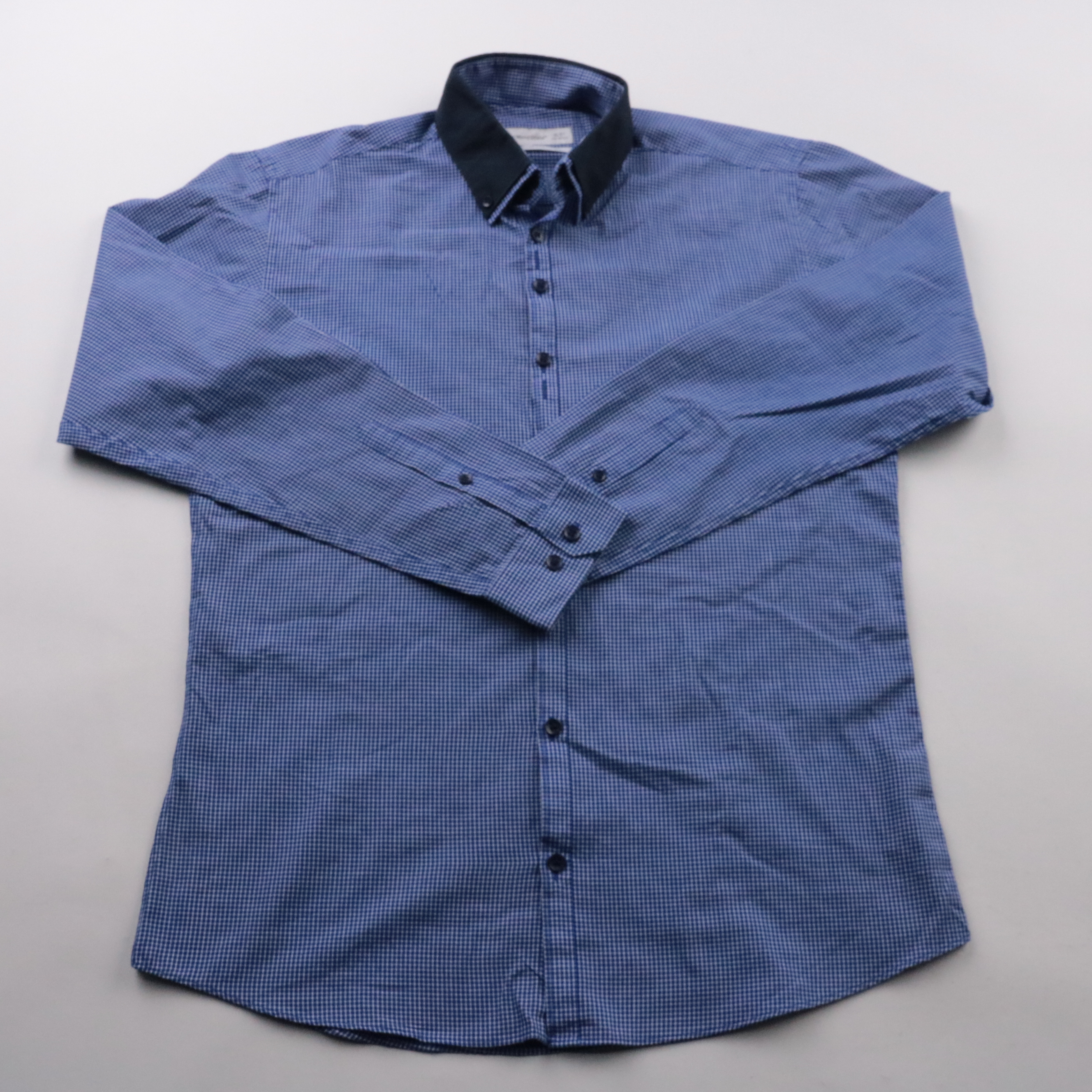Мужская рубашка Cedar Wood State Slim Fit в мелкую синюю клетку с контрастным тёмным воротником и длинным рукавом. Подойдёт для офиса и повседневных образов, хорошо сочетается с брюками и джинсами. Практичный состав с полиэстером меньше мнётся и проще ...