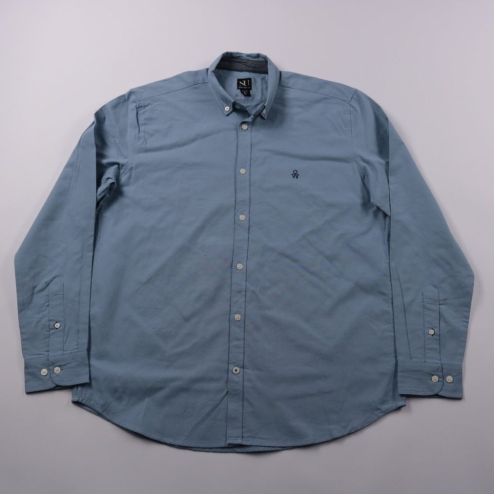 Мужская рубашка Straight Up из оксфордского хлопка, спокойного голубого цвета, с классическим воротником на пуговицах и вышитым логотипом на груди. Подойдёт для офиса и повседневных образов с джинсами или брюками. Натуральный хлопок хорошо дышит и комф...