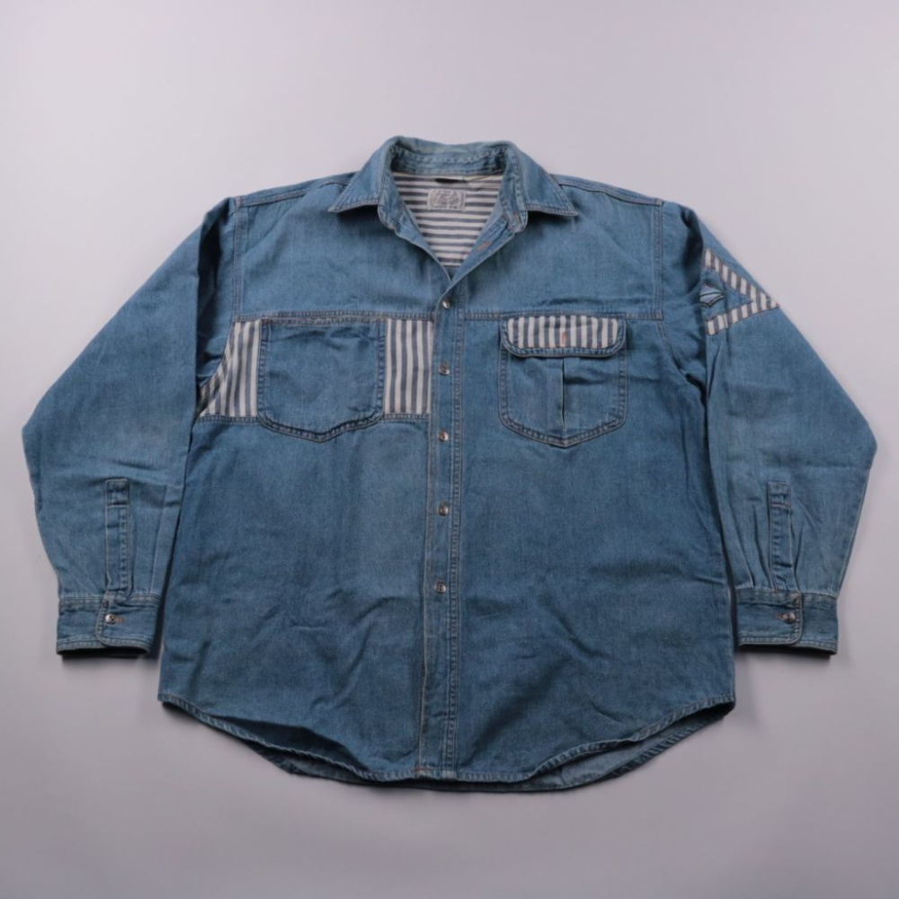 Мужская джинсовая рубашка Men's Company из 100% хлопка, с длинным рукавом и накладными карманами, декорирована вставками в полоску. Подойдёт для повседневной носки и образов в стиле casual, можно носить как рубашку или как лёгкую верхнюю. Плотный деним...