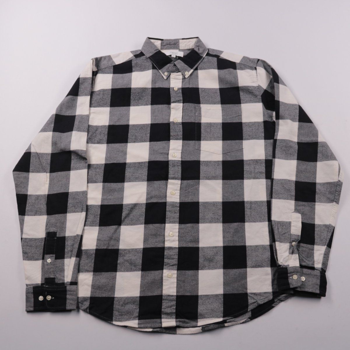 Мужская рубашка Next в крупную чёрно-белую клетку, с воротником на пуговицах и нагрудным карманом. Подойдёт для повседневных образов и офиса в стиле casual, удобно носить как самостоятельно, так и поверх футболки. Натуральный хлопок хорошо дышит и комфортен в течение дня.