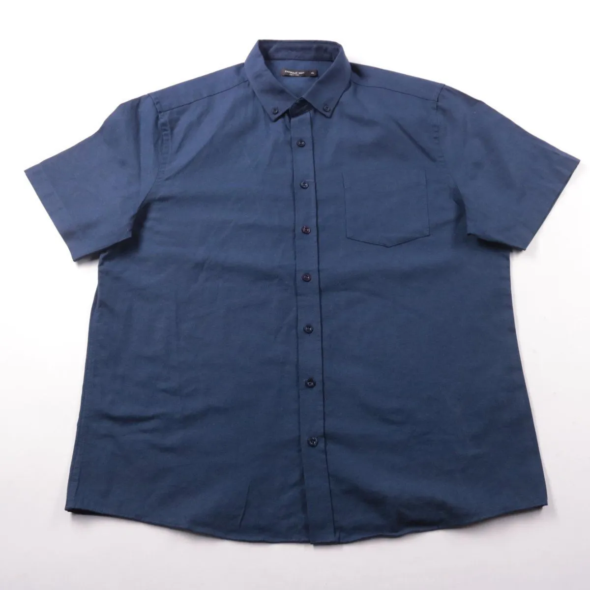 Мужская рубашка Capsule Men тёмно-синего цвета с коротким рукавом и застёжкой на пуговицы, есть нагрудный карман и воротник button-down. Подойдёт для повседневных образов, офиса с нестрогим дресс-кодом и летних прогулок. Смесь хлопка и полиэстера легче мнётся и проще в уходе.