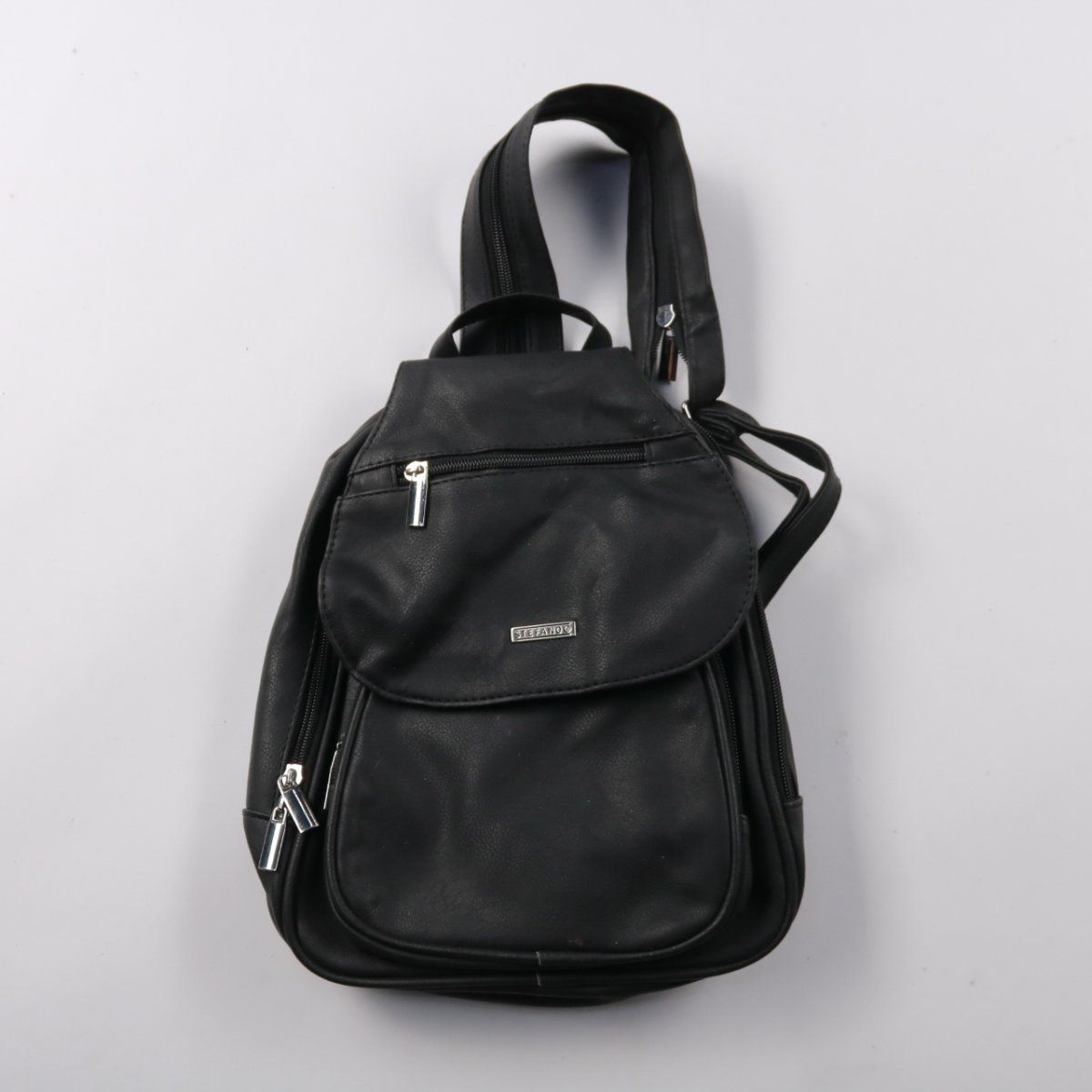 Рюкзак Stefano из чёрной экокожи, компактный и мягкой формы, с несколькими отделениями на молниях. Подойдёт для города и поездок, когда нужно взять самое необходимое и держать вещи раздельно. Удобные лямки и верхняя ручка позволяют носить его на спине или в руке.
