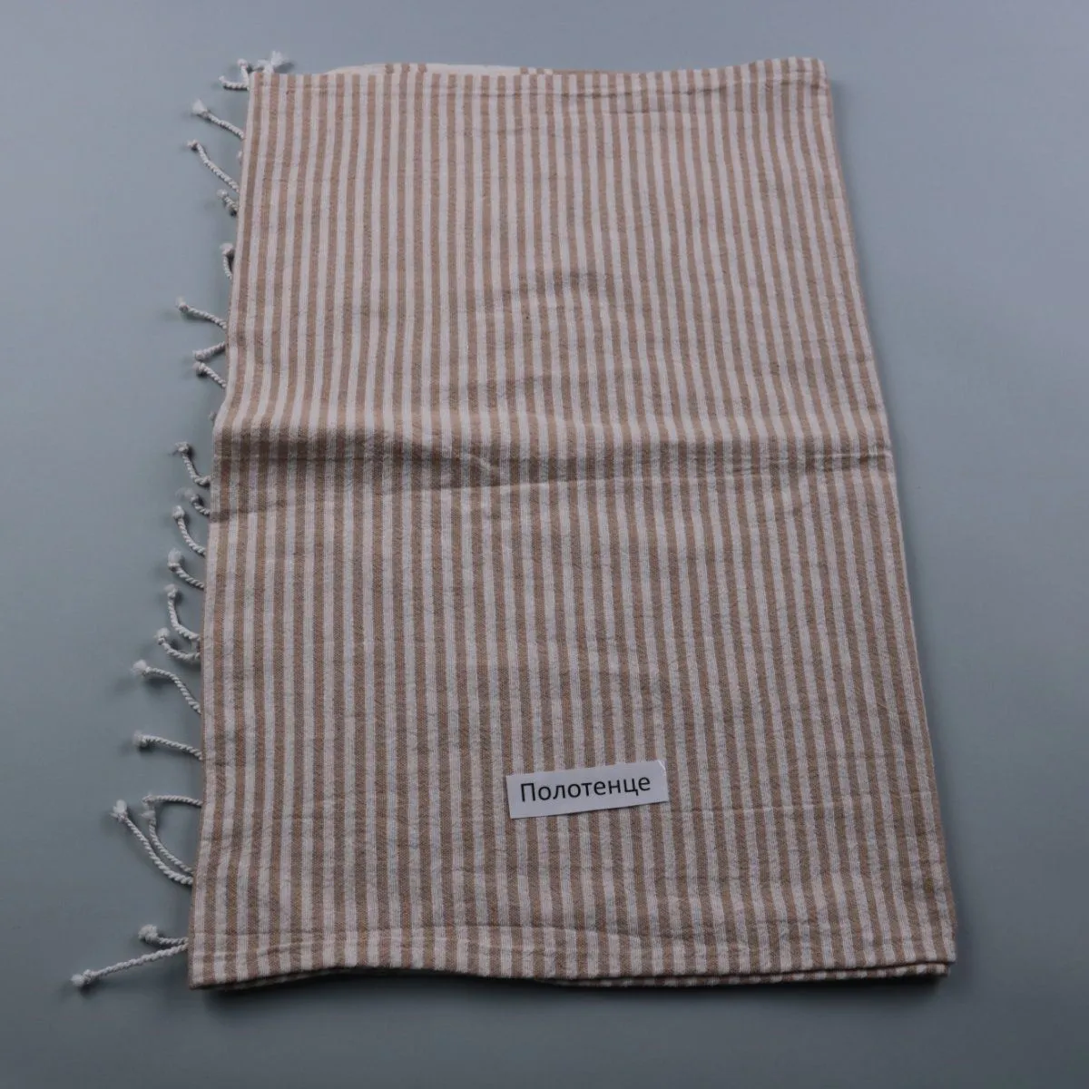 Полотенце в бежево-белую полоску с декоративной бахромой по краю. Подойдёт для ванной, сауны или пляжа, лёгкое и быстро сохнет благодаря смешанному составу.