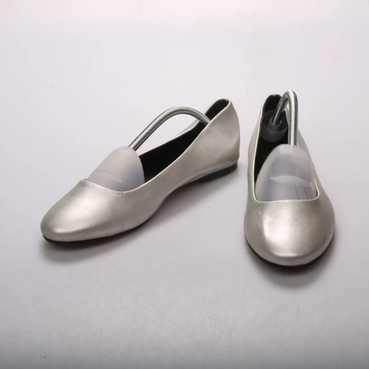 Балетки Graceland серебристого цвета с округлым носком и низким ходом. Подойдут для офиса и повседневных образов в тёплое время года и в помещении; есть следы носки на подошве и небольшие потёртости. Плоская подошва удобна для длительной ходьбы.