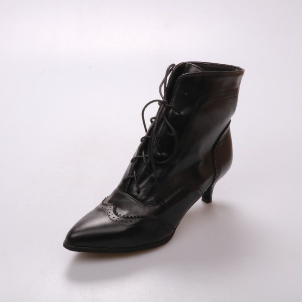 Женские ботильоны на шнуровке с декоративной перфорацией в стиле брогов, чёрного цвета, на невысоком каблуке. Подойдут для повседневных и офисных образов в демисезон. Удобная шнуровка помогает плотнее зафиксировать ногу.