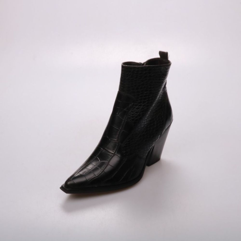 Женские ботильоны с острым носом и устойчивым каблуком, фактурная поверхность под рептилию. Подойдут для повседневных образов и выходов в прохладную погоду. Удобно надевать за счёт боковой молнии.