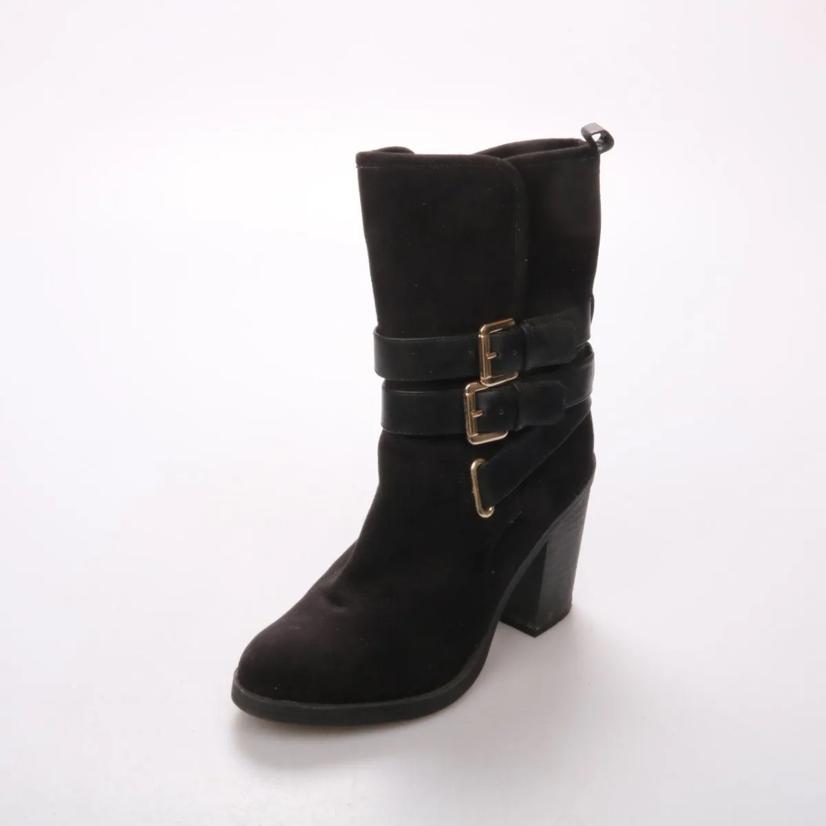 Женские ботильоны New Look из искусственной замши, чёрного цвета, на устойчивом каблуке и с ремешками на пряжках. Подойдут для повседневных образов в прохладную погоду — с джинсами, платьями или юбками. Каблук-столбик добавляет высоту и остаётся удобным при ходьбе.