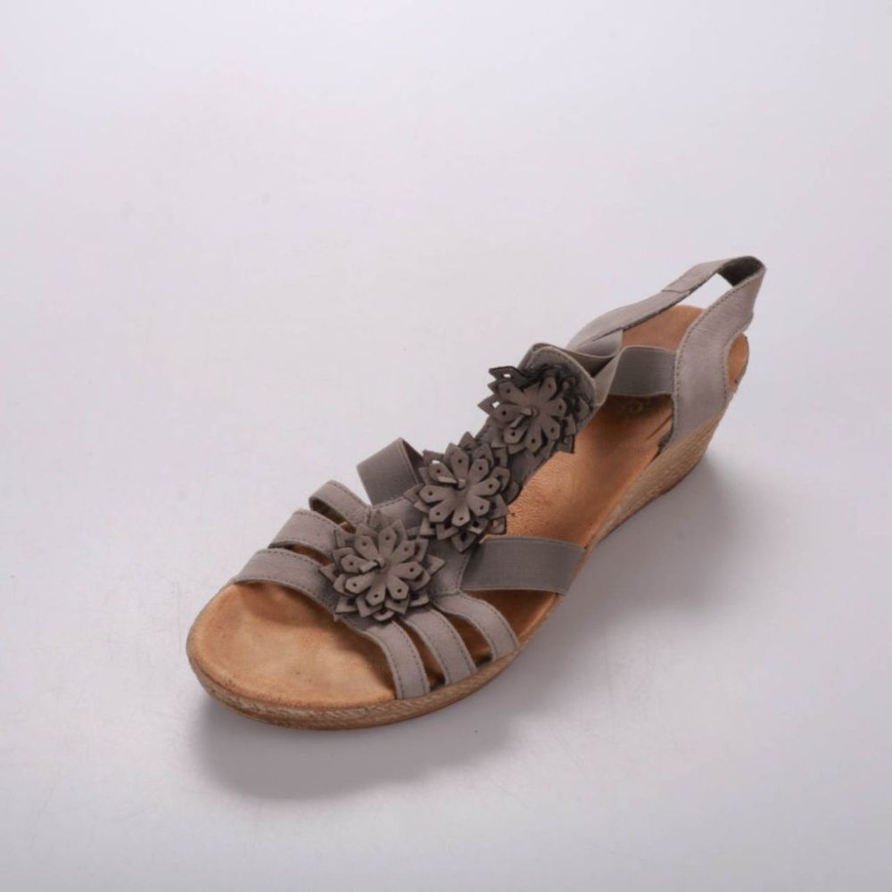 Женские сандалии Rieker на устойчивой танкетке, серого цвета, с декоративными цветами на ремешках. Подойдут для повседневных летних прогулок и поездок, хорошо сочетаются с платьями и шортами. Удобная посадка за счёт эластичных вставок и мягкой стельки.