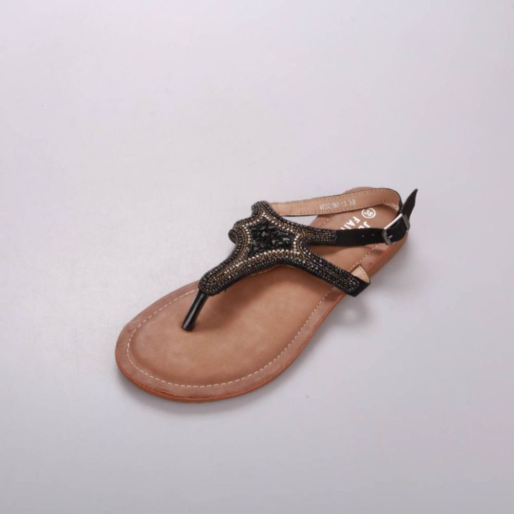 Женские сандалии Jenny Fairy с декором из бусин и страз и ремешком на щиколотке. Подойдут для летних прогулок и отдыха, легко сочетаются с платьями и шортами. Плоская подошва и фиксирующая застёжка делают посадку более стабильной.