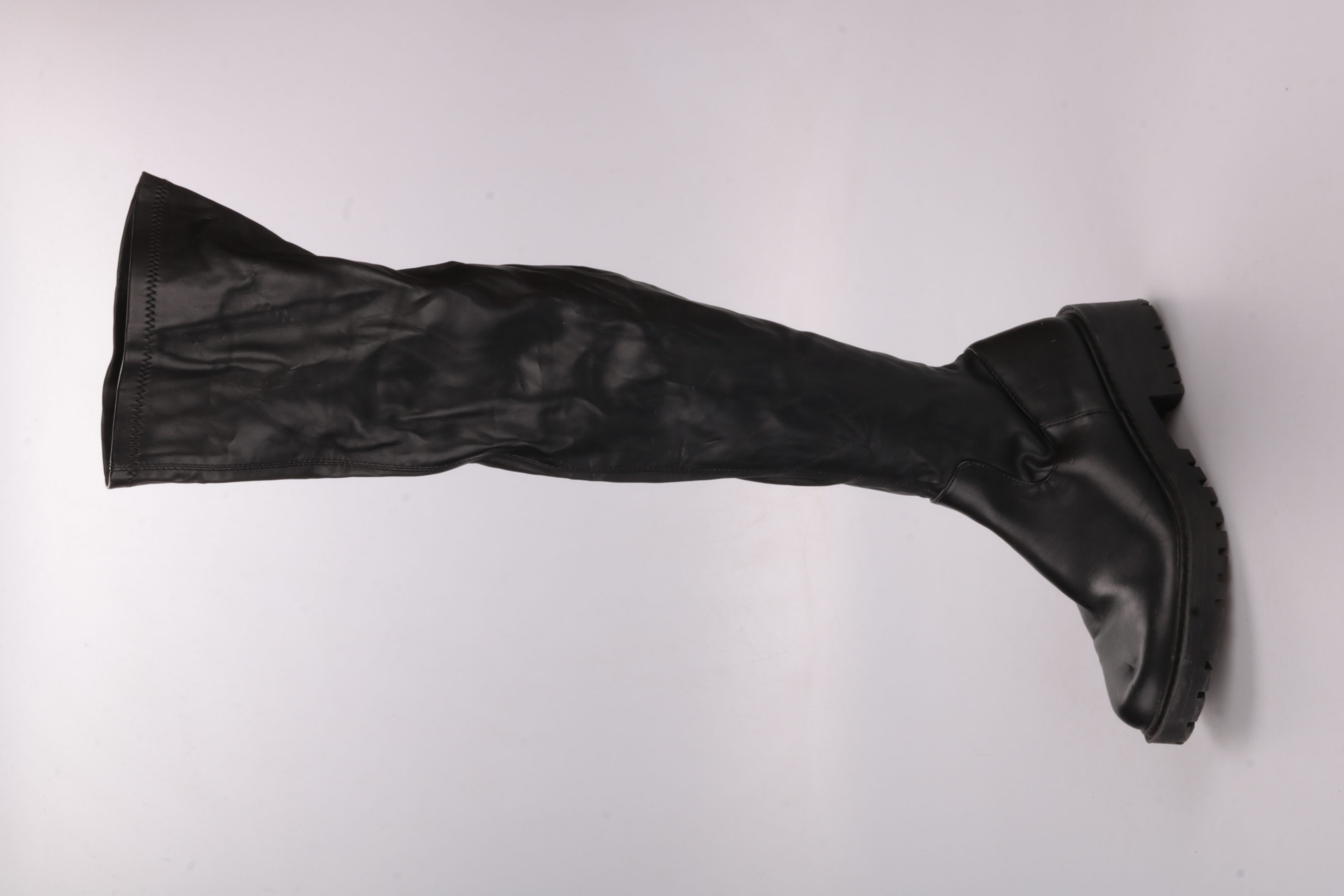 Женские высокие сапоги-чулки без бренда, чёрного цвета, на массивной тракторной подошве. Мягкое голенище хорошо смотрится с платьями, юбками и узкими джинсами в прохладную погоду. Боковая молния помогает быстро надевать и снимать обувь.