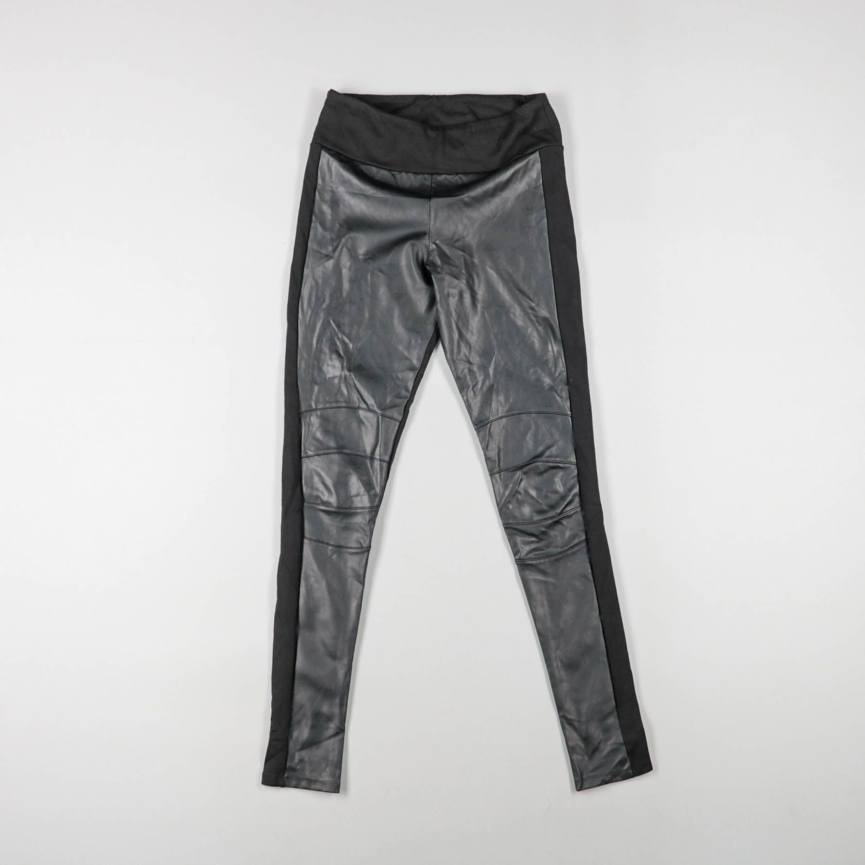 Женские легинсы с вставками под кожу спереди и эластичной тканью сзади, бренд не указан. Подойдут для прогулок и повседневных образов в прохладную погоду. Широкий пояс хорошо держится на талии и не перекручивается.
