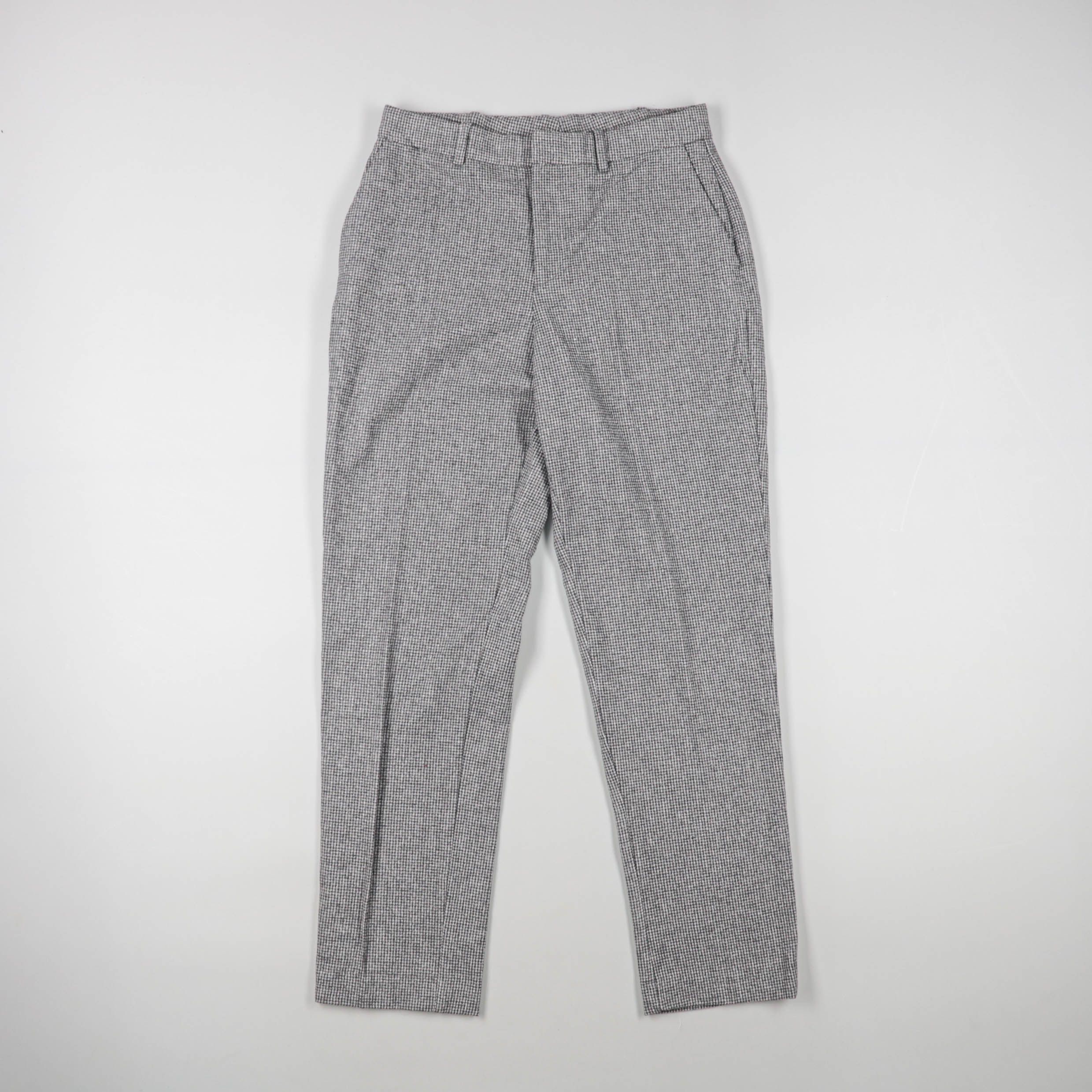 Женские классические брюки в мелкую клетку, прямого кроя и со стрелками. Подойдут для офиса и повседневных образов с рубашкой или свитером. Практичный плюс — немаркий серый цвет и универсальный принт, который легко сочетать с базовой обувью.