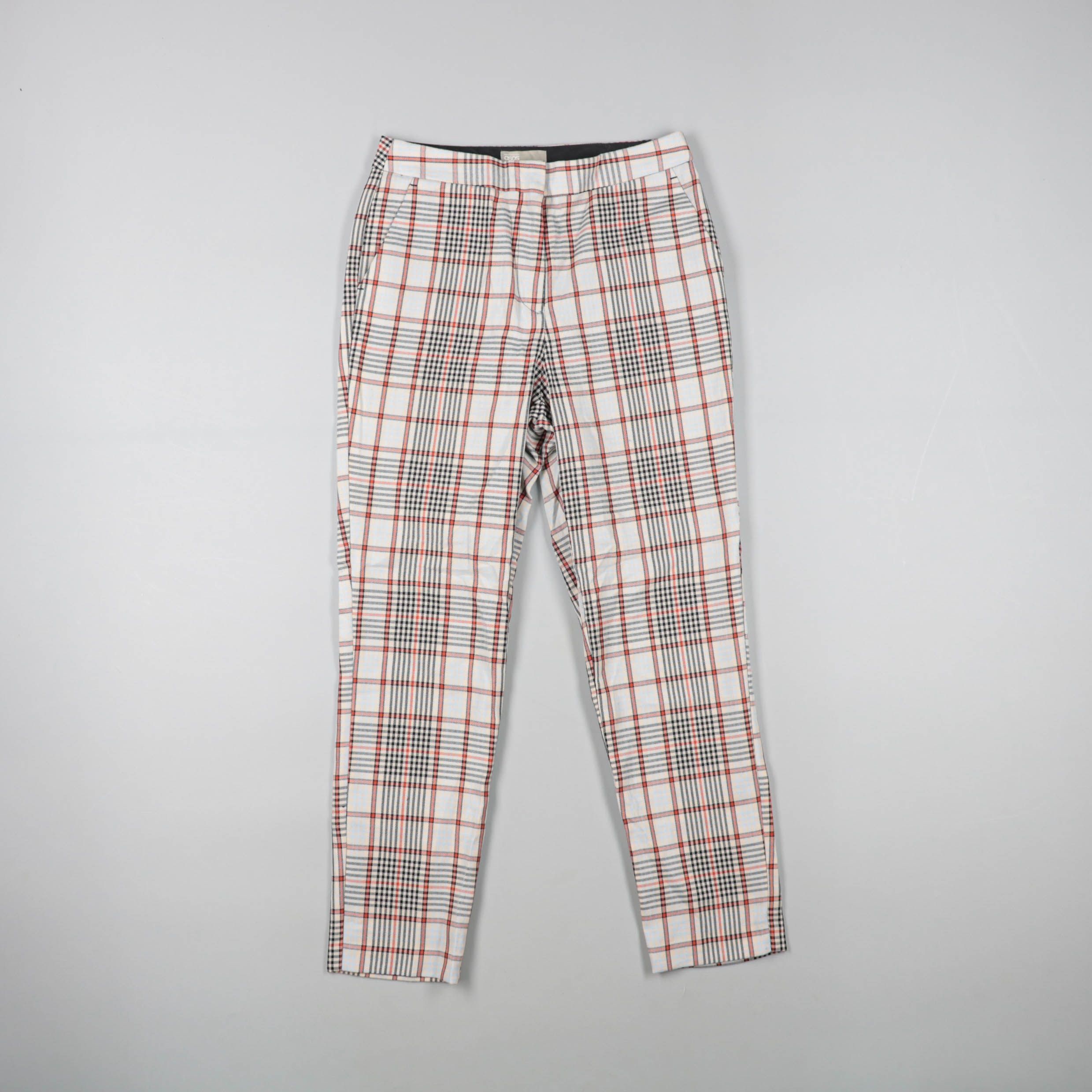 Женские брюки в клетку в светлой гамме (белый/чёрный с красными линиями), с застёжкой на молнию и карманами. Подойдут для повседневных и офисных образов с однотонным верхом и жакетом. Плотная ткань держит форму и выглядит аккуратно в течение дня.