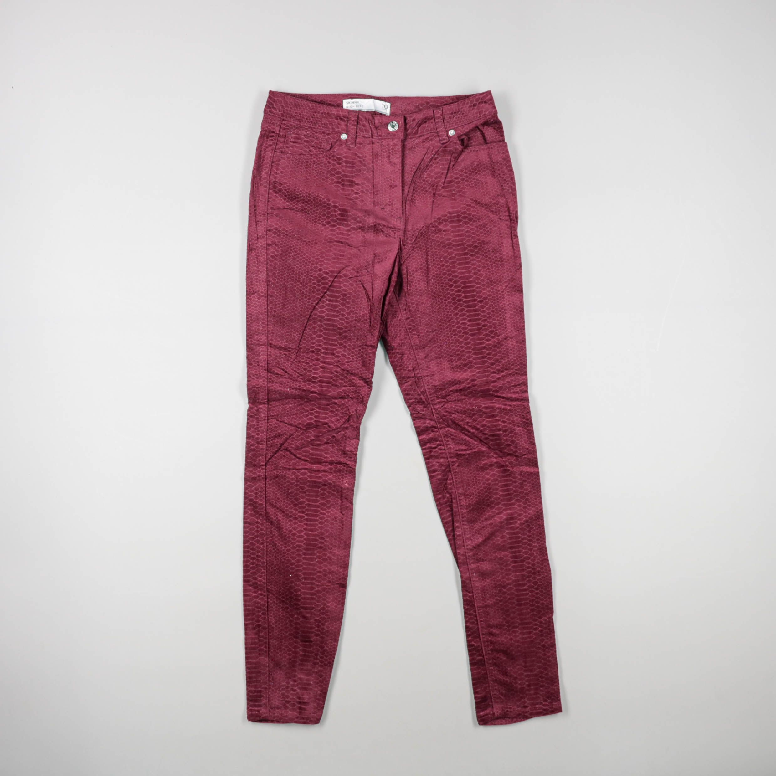 Женские зауженные брюки с фактурой под кожу рептилии, бренд на бирке не читается. Подойдут для повседневных образов и вечерних выходов за счёт акцентного бордового цвета. Плотный материал держит форму и хорошо сочетается с базовыми топами и жакетами.