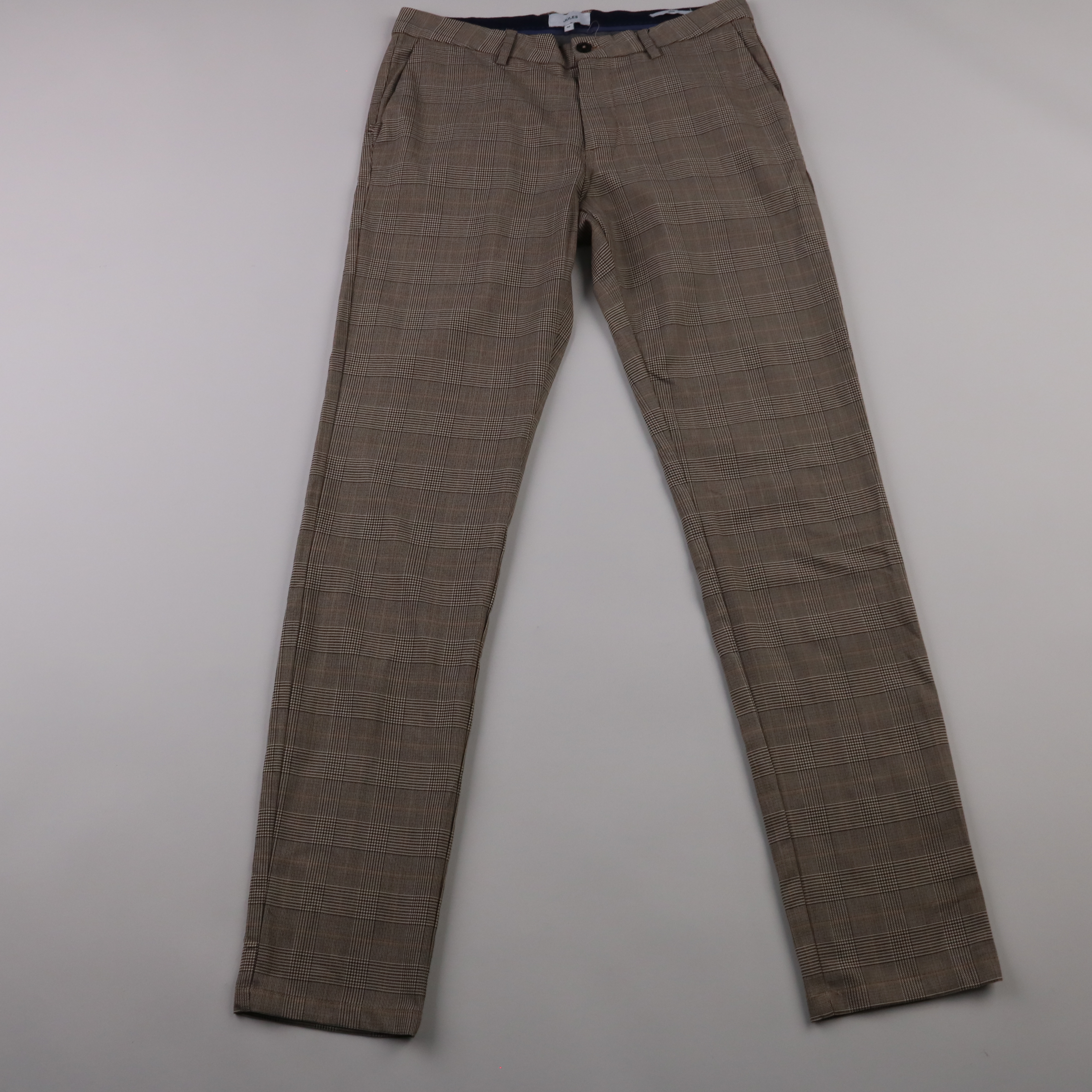 Женские брюки Jules в коричневой клетке, прямого кроя с застёжкой на молнию и пуговицу. Подойдут для офиса и повседневных образов с рубашкой или свитером. Ткань со стрейчем (полиэстер/вискоза/эластан) хорошо держит форму и комфортна в носке.