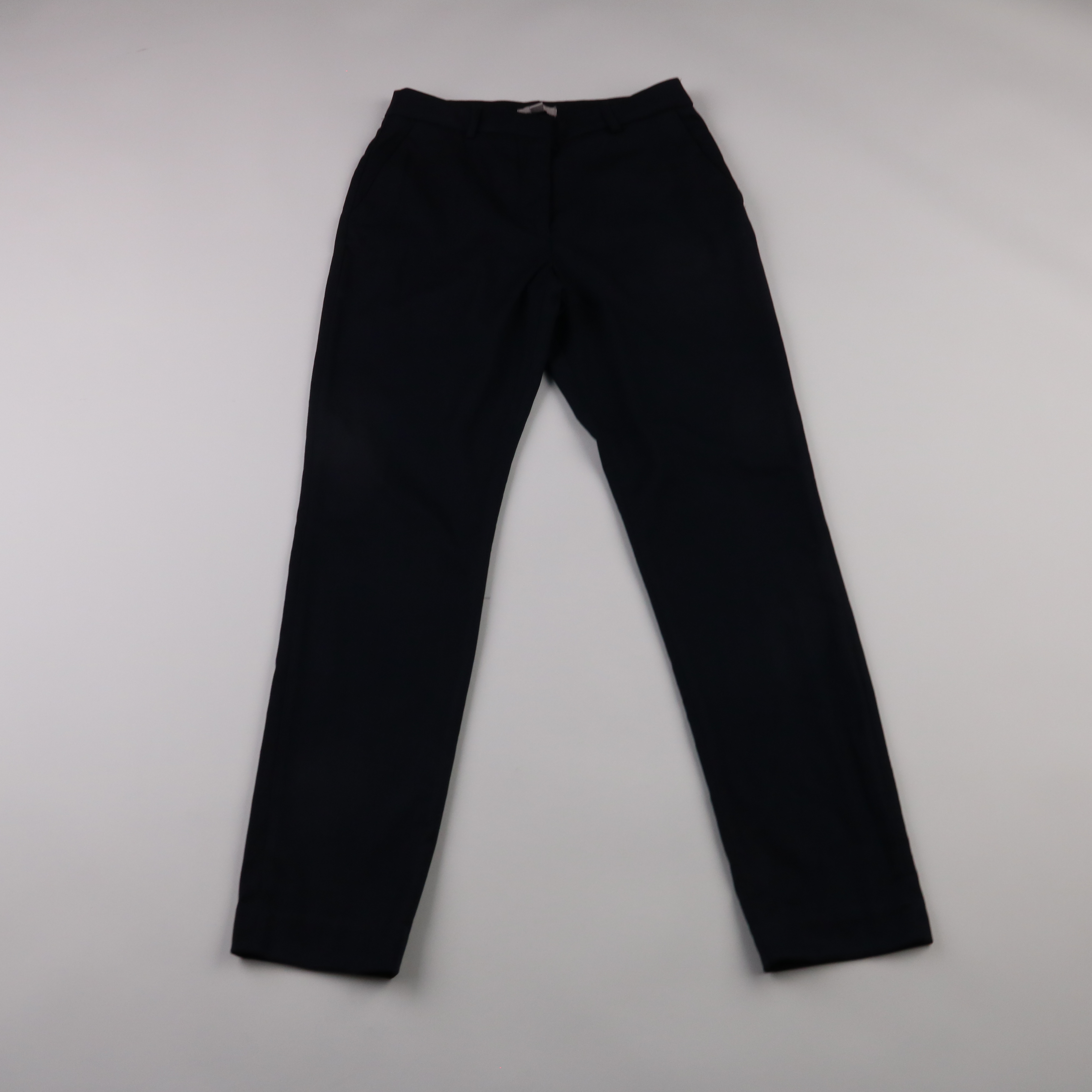 Женские классические брюки H&M прямого кроя в тёмно-синем (почти чёрном) цвете. Подойдут для офиса и повседневных образов, легко сочетаются с рубашками и жакетами. Практичный плюс — немаркий цвет и лаконичный дизайн.