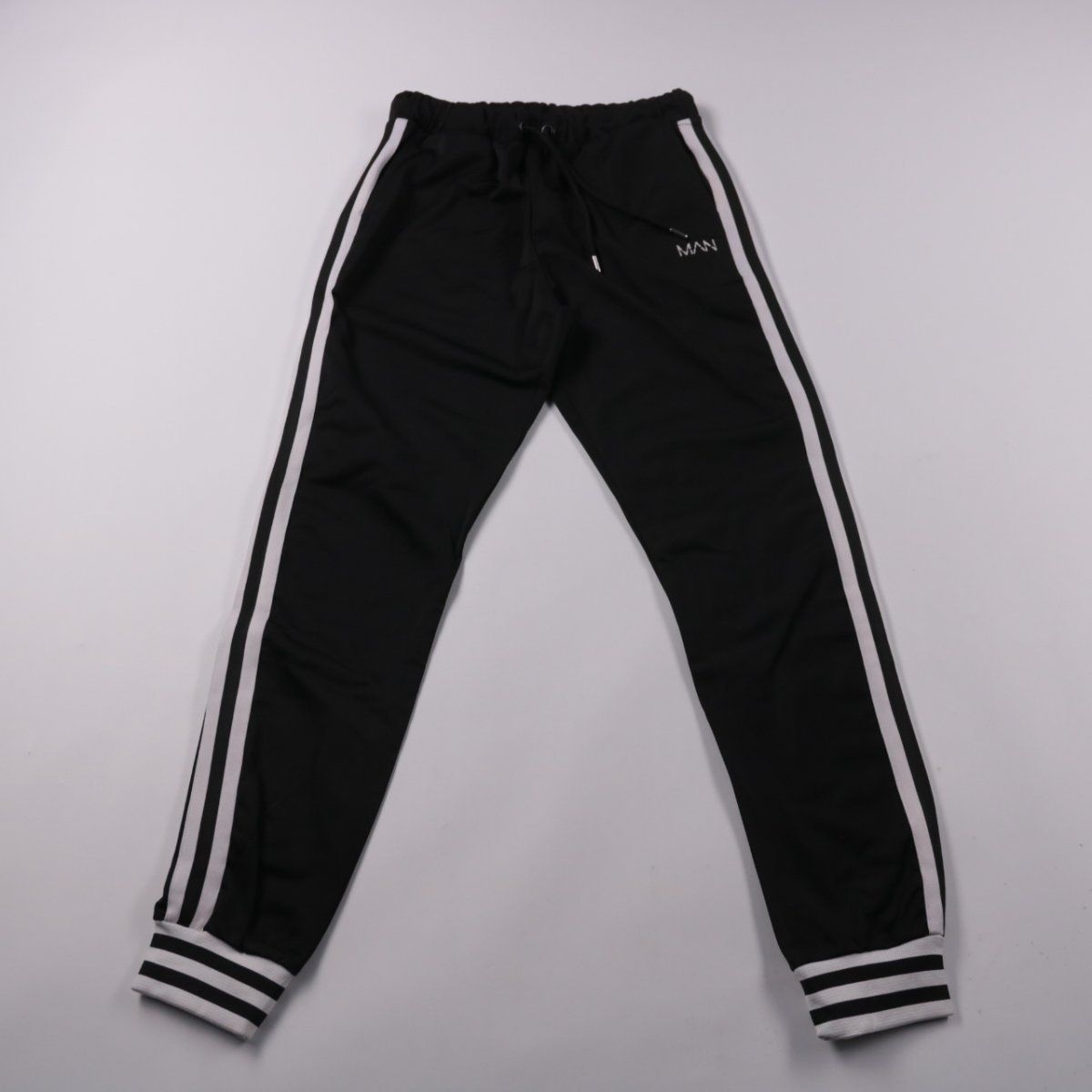 Спортивные брюки BoohooMAN в чёрном цвете с белыми лампасами и манжетами. Подойдут для прогулок, поездок и повседневных образов в стиле athleisure. Эластичный пояс со шнурком позволяет удобно регулировать посадку.