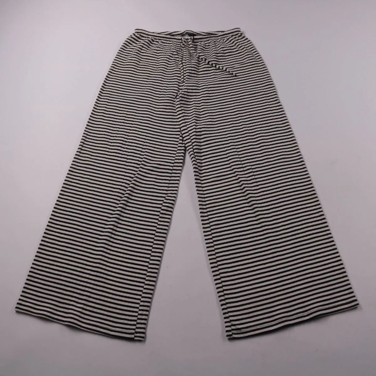 Женские трикотажные брюки Gina Tricot в чёрно-белую полоску, с эластичным поясом и шнурком для регулировки посадки. Подойдут для дома, отдыха и повседневных образов в тёплое время или как комфортная базовая вещь круглый год. Мягкий хлопковый состав со стрейчем хорошо тянется и не сковывает движения.