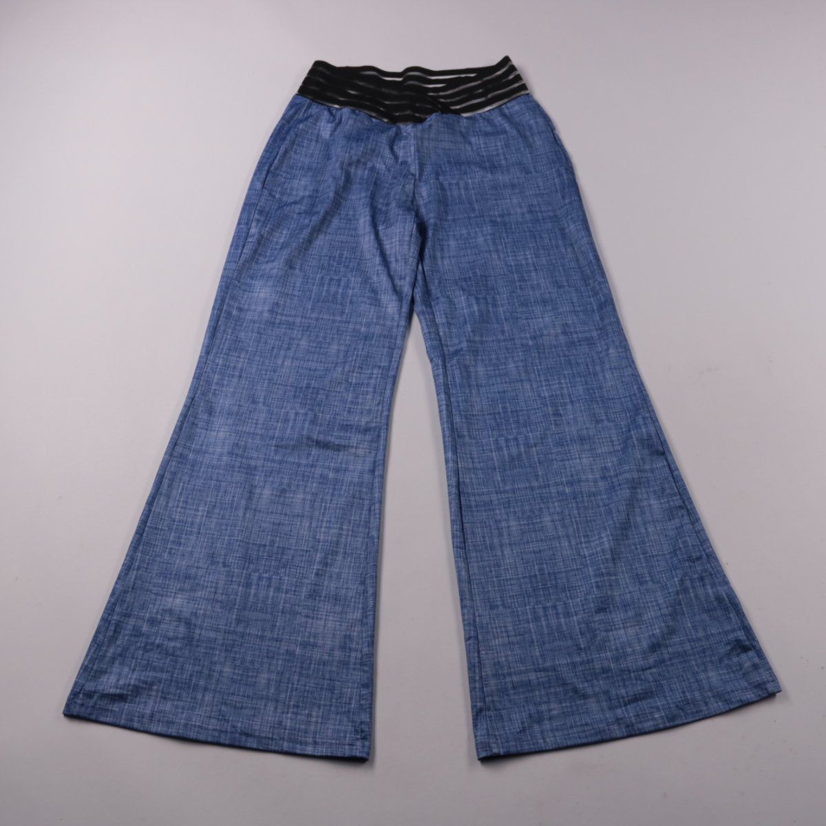 Женские брюки свободного кроя (палаццо) голубого цвета с чёрным эластичным поясом. Подойдут для летних прогулок и повседневных образов благодаря лёгкой ткани и широким штанинам. Пояс на резинке удобно садится по талии.