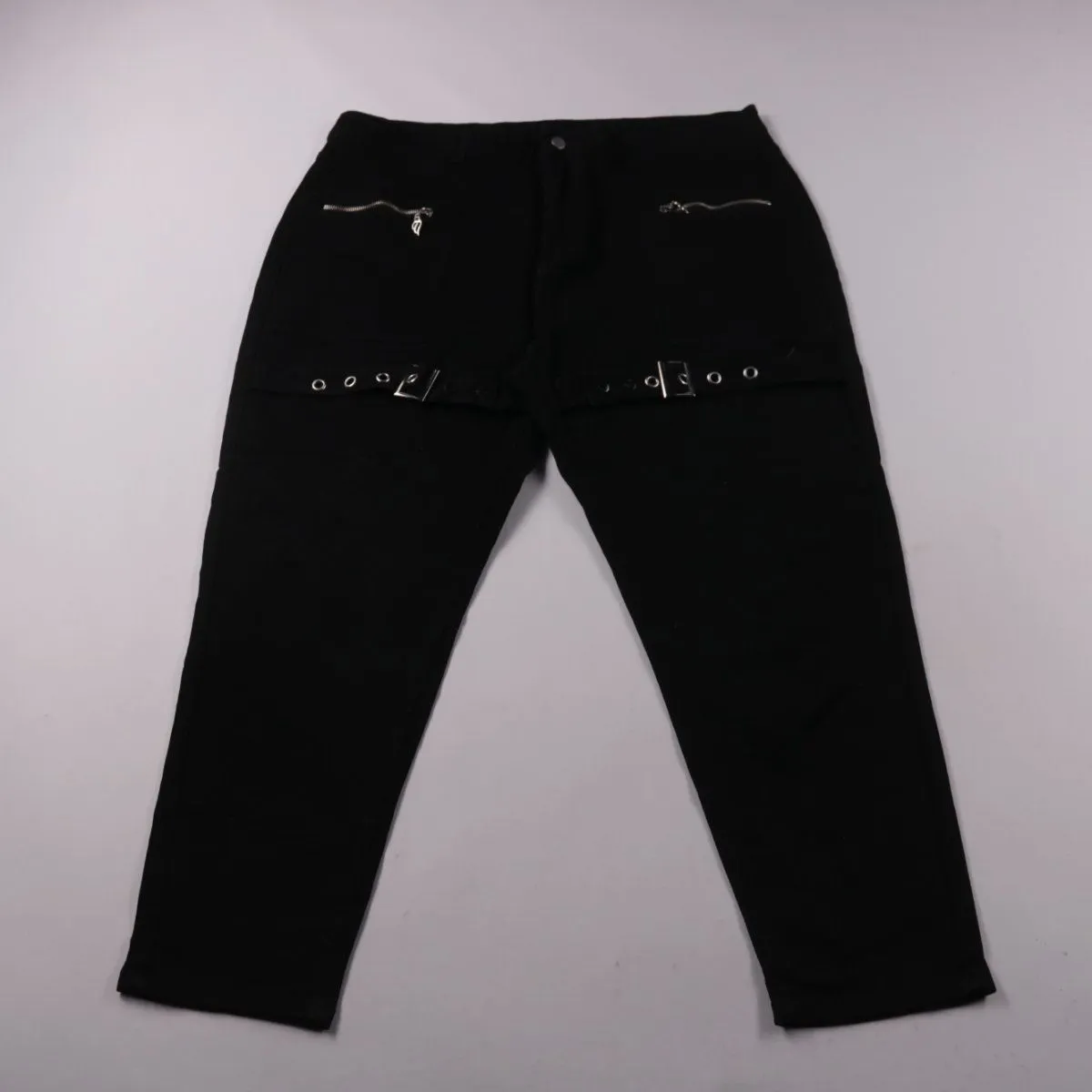 Женские чёрные брюки SHEIN Curve прямого кроя с декоративными ремешками и металлическими пряжками на бёдрах. Подойдут для повседневных образов и стилизаций в стиле casual/urban. Плотная хлопковая ткань хорошо держит форму и комфортна в носке.