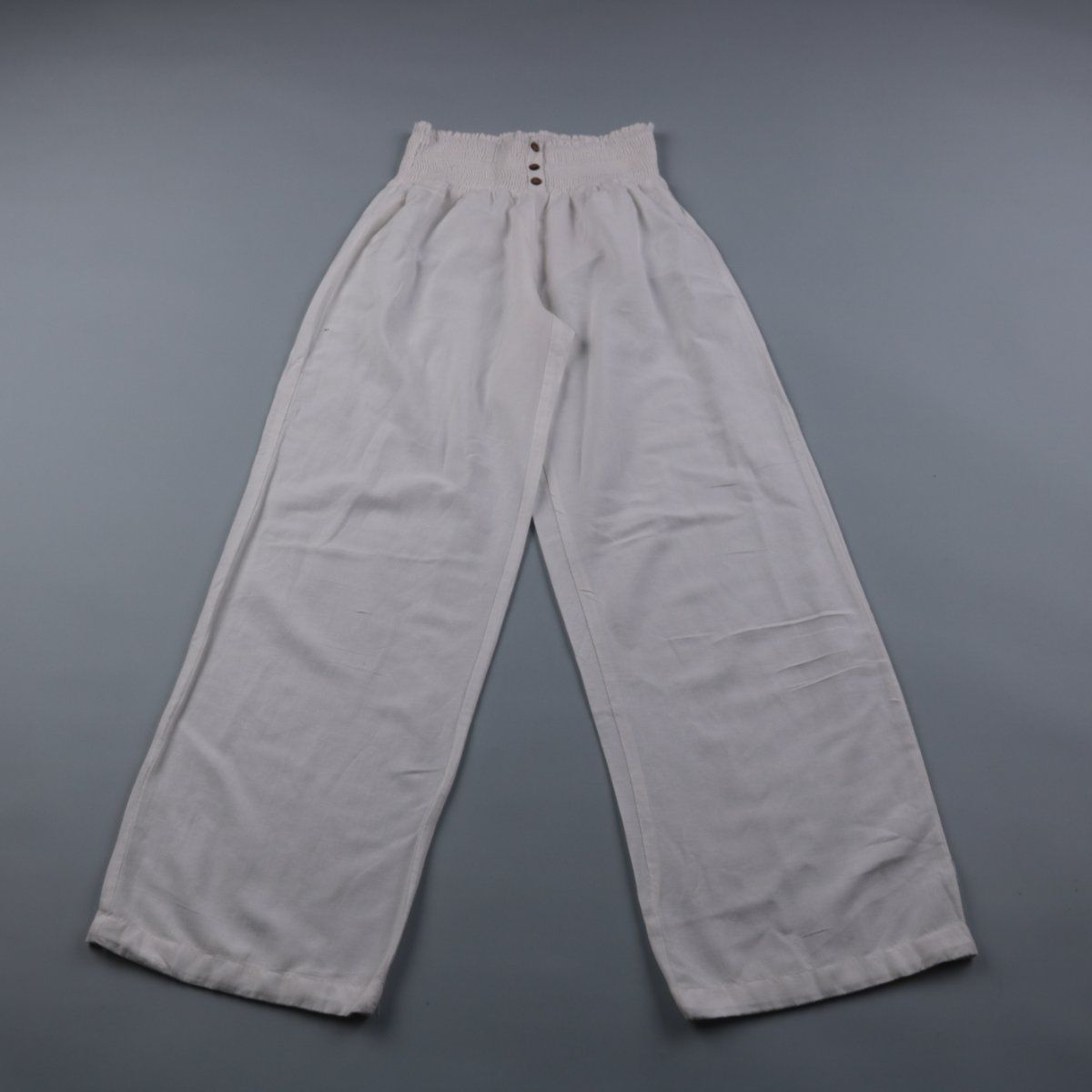 Брюки Vero Moda белого цвета с высокой посадкой и широкой эластичной талией на пуговицах. Подойдут для летних повседневных образов и отдыха благодаря свободному крою. Смесовая ткань с льном и хлопком хорошо пропускает воздух.