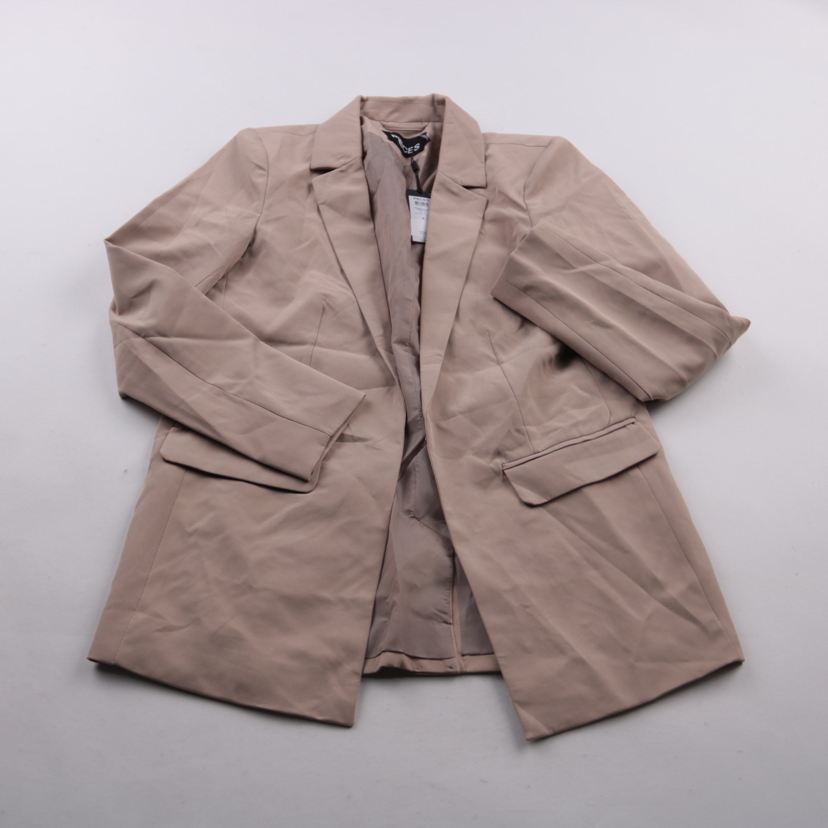 Женский пиджак Pieces свободного кроя в бежевом оттенке Silver Mink. Подойдёт для офиса и повседневных образов, легко сочетается с джинсами, брюками и платьями. Эластичная ткань тянется и комфортно садится по фигуре.