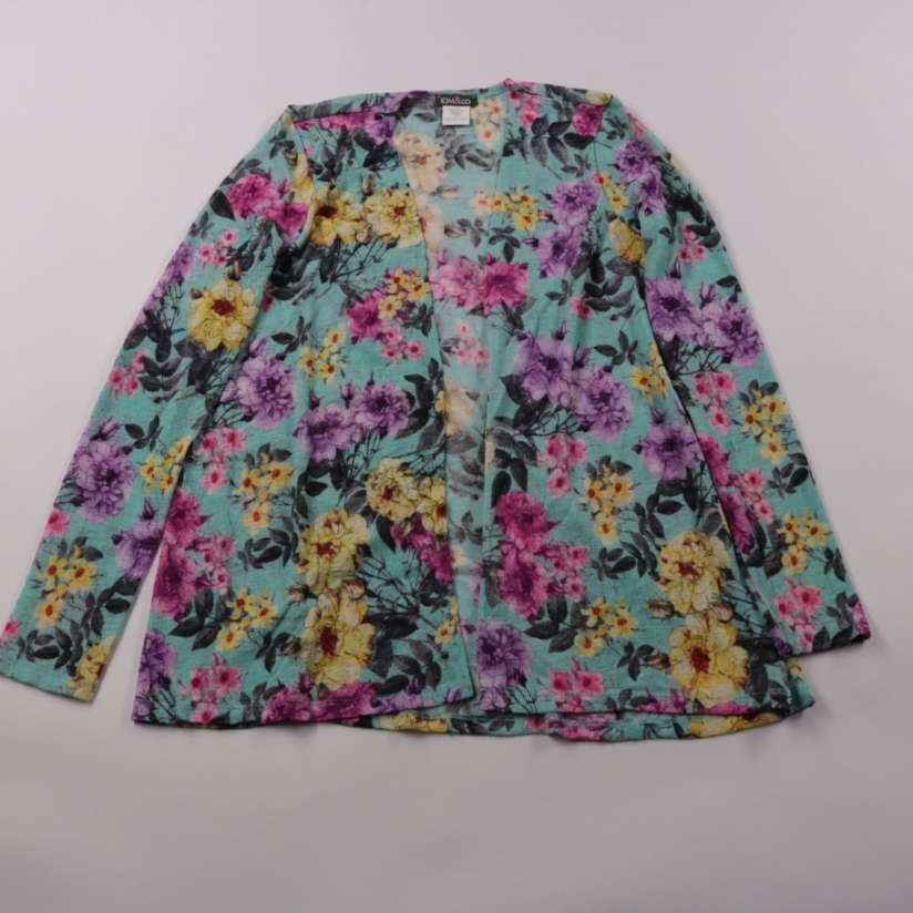 Женский пиджак KIM&CO. с ярким цветочным принтом на бирюзовом фоне и без застёжки. Подойдёт для офиса и повседневных образов в тёплую весну/осень, хорошо сочетается с однотонными брюками или платьем. Трикотажная ткань с эластаном тянется и комфортно са...