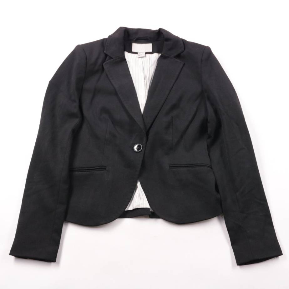 Женский укороченный пиджак H&M чёрного цвета с одной пуговицей и прорезными карманами. Подойдёт для офиса, учёбы и аккуратных повседневных образов, легко сочетается с платьями и брюками. Есть подкладка — удобнее надевать и лучше держит форму.