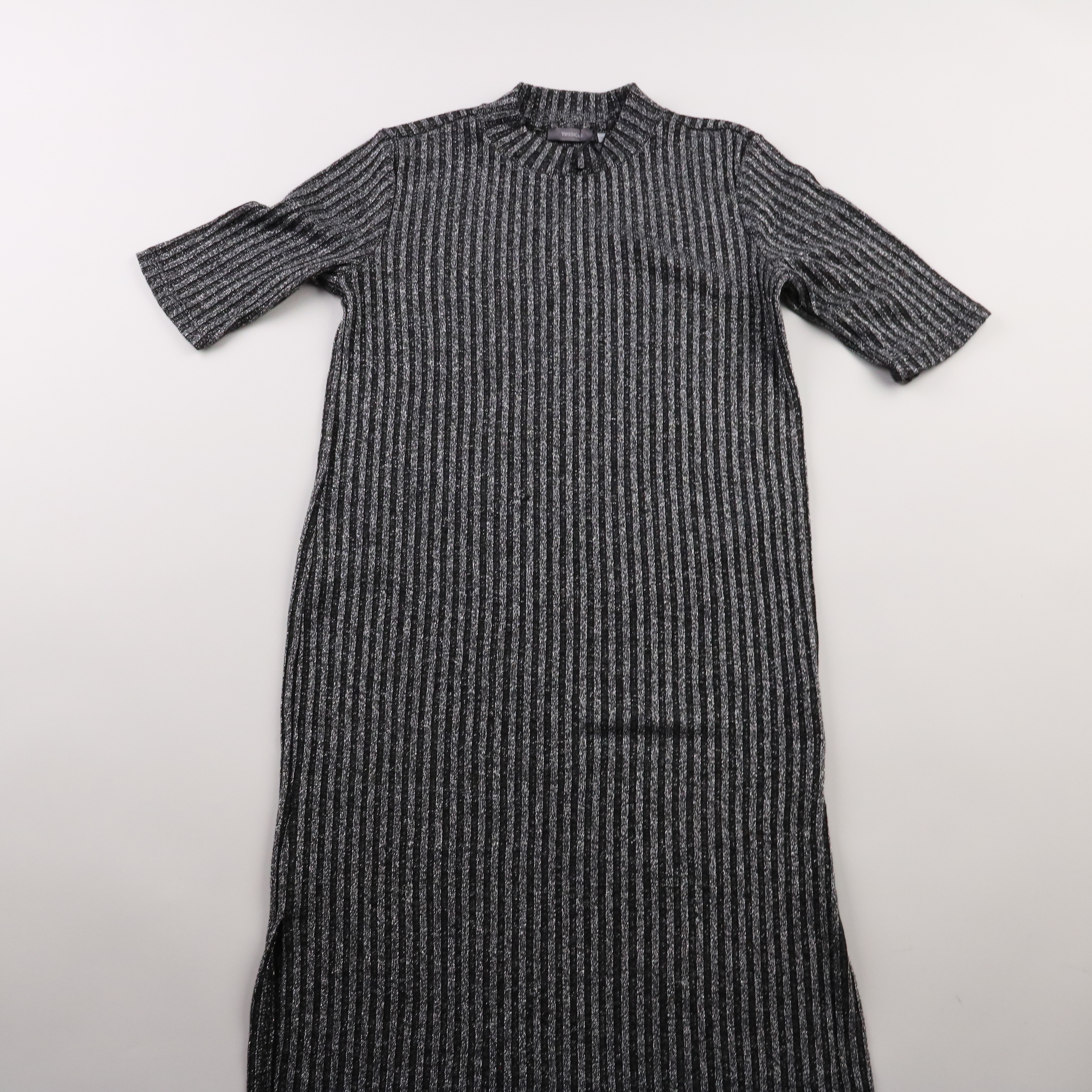 Повседневное платье Yessica из трикотажа в рубчик, чёрного цвета с серыми полосками и рукавом 3/4. Подойдёт для офиса и на каждый день, хорошо смотрится с ботильонами или кедами. Ткань тянется и комфортно садится по фигуре, не сковывая движения.
