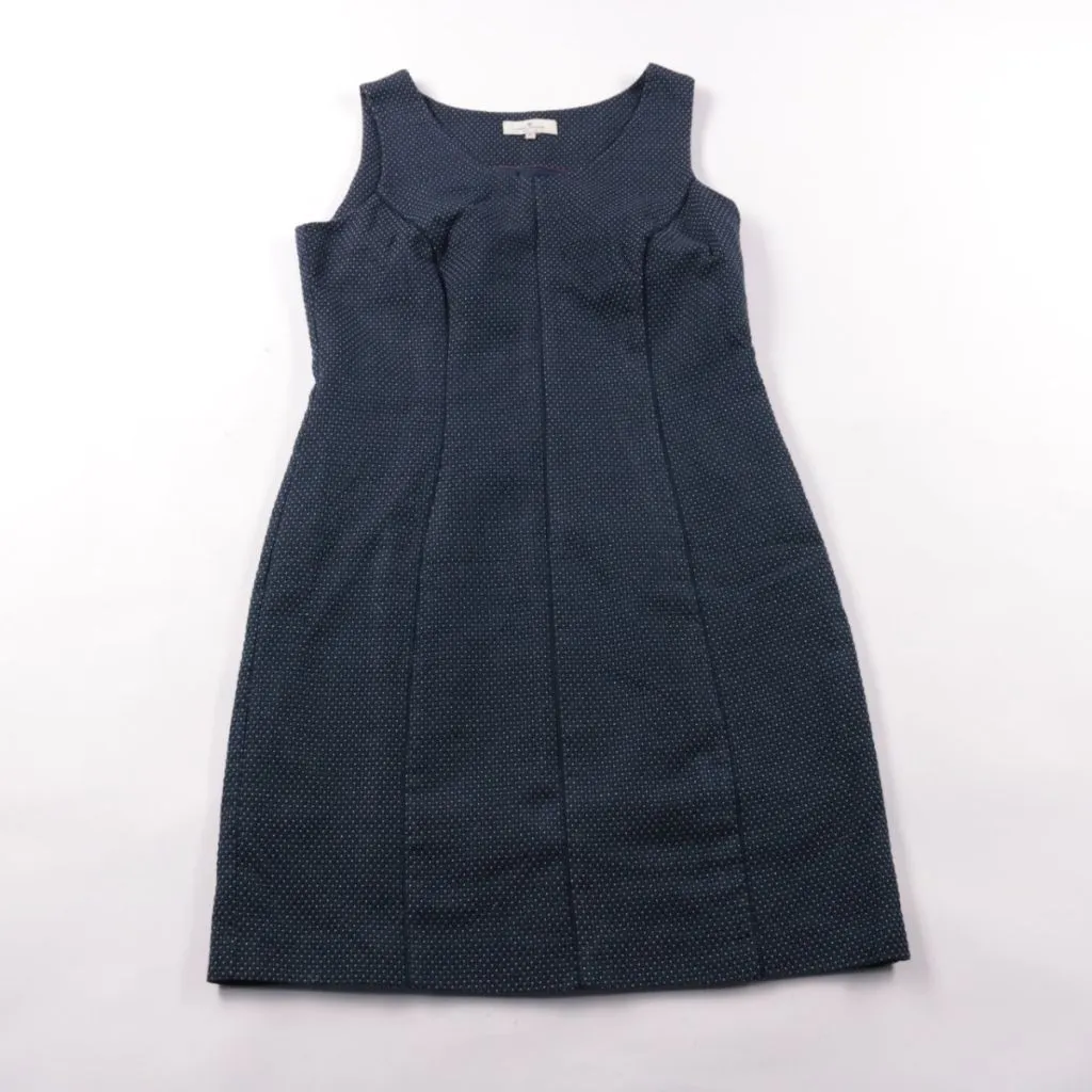 Повседневное платье Tom Tailor без рукавов, тёмно-синее с мелким фактурным узором и приталенными вытачками. Подойдёт для офиса и спокойных выходов, хорошо смотрится с жакетом или кардиганом. Плотная ткань держит форму и аккуратно сидит по фигуре.
