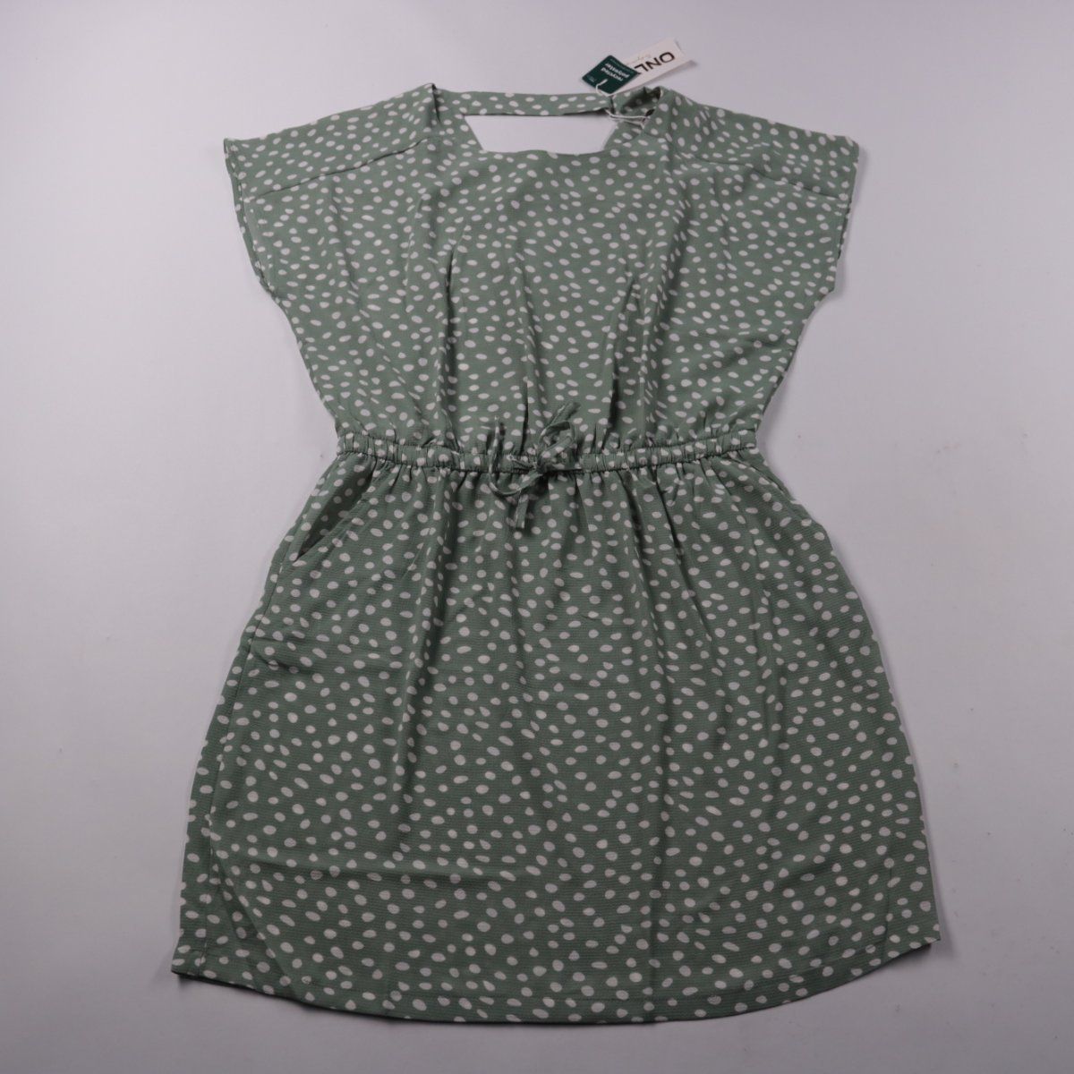 Повседневное платье ONLY в зелёном цвете с белым принтом в горошек. Лёгкая ткань и резинка на талии со шнурком помогают подогнать посадку — удобно для прогулок и на каждый день. Практично тем, что легко сочетать с кедами и сандалиями.