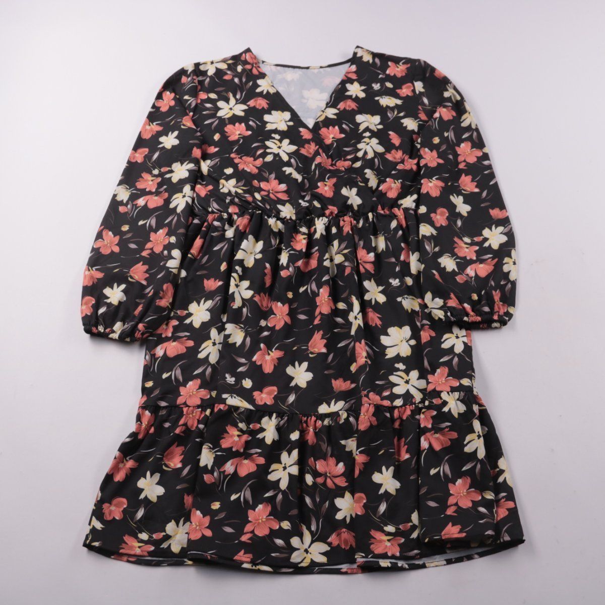 Повседневное платье с цветочным принтом и V-образным вырезом, рукава длинные с резинкой по низу. Подойдёт для прогулок и повседневных образов в тёплую погоду или в межсезонье. Ткань практически не мнётся и проста в уходе.